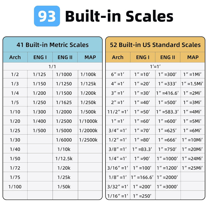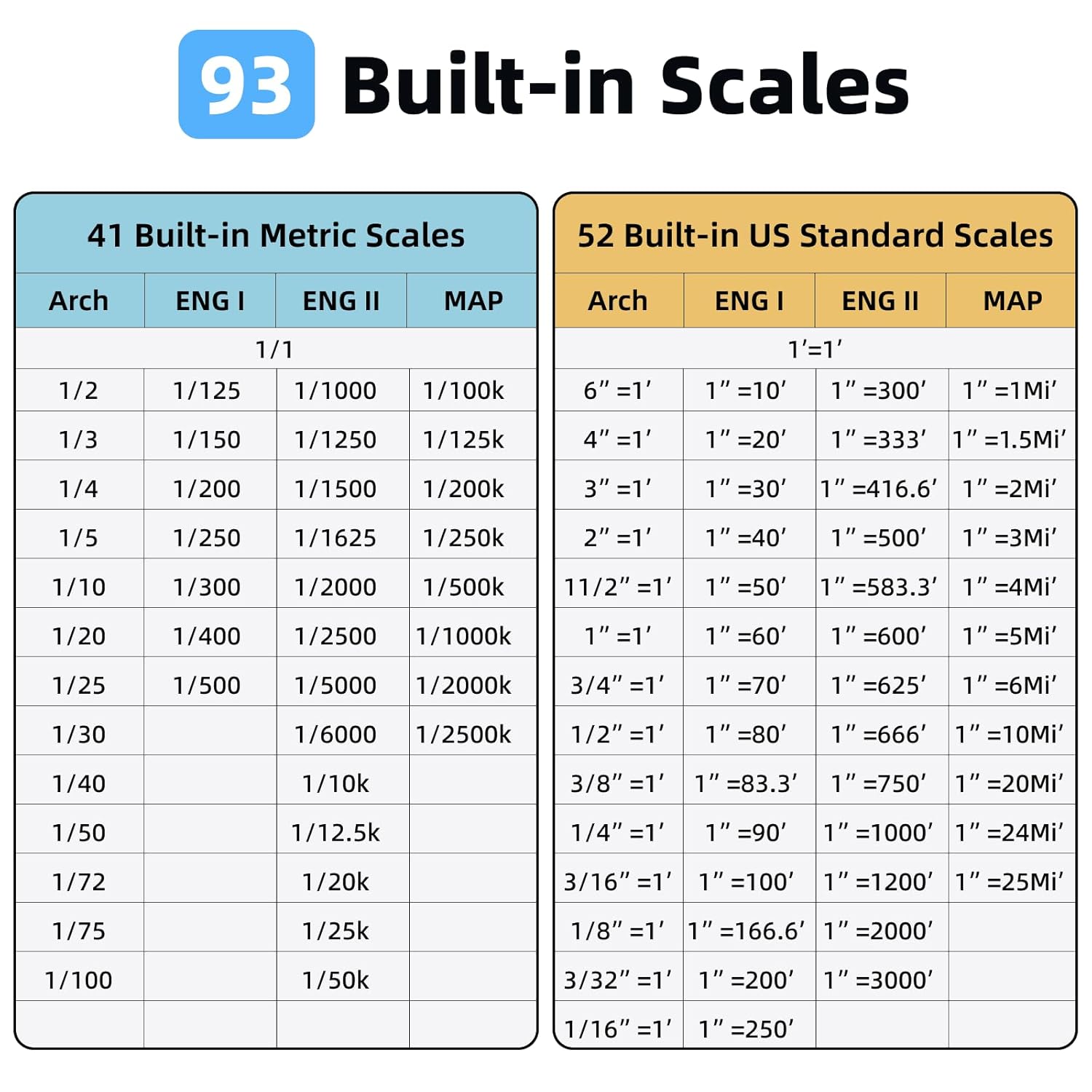 - 93 integrierte Waagen: NeoRuler bietet 93 integrierte Skalen für maximale Vielseitigkeit. Mehrere Einheiten: Dezimalfüsse, Fuss, Dezimalzoll, Yards, Millimeter, Meter, Kilometer
