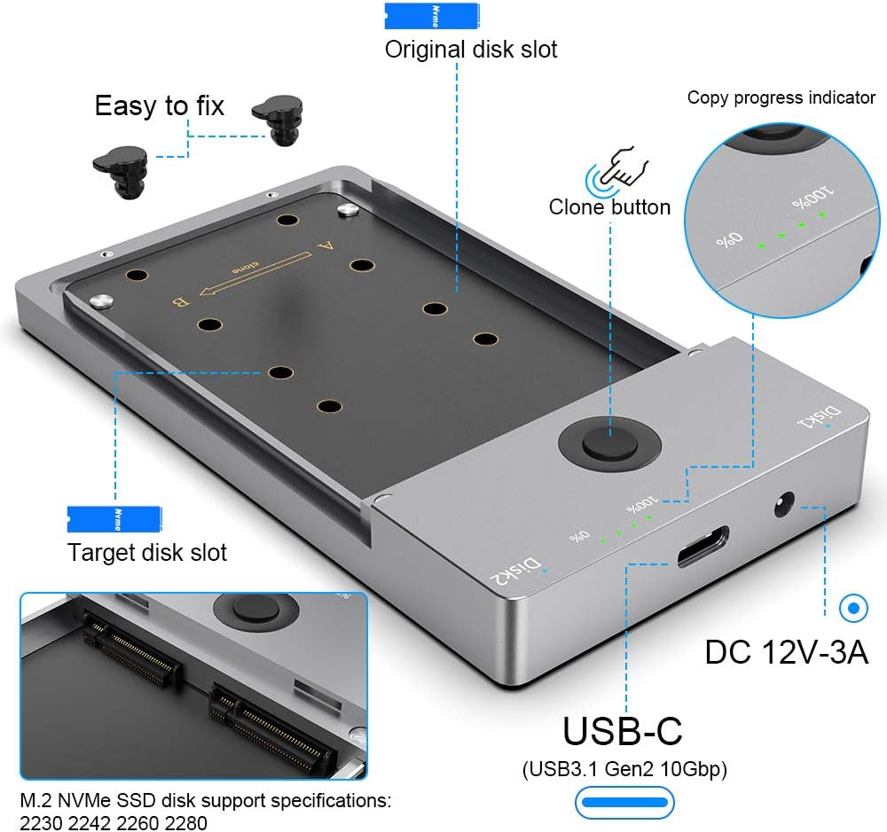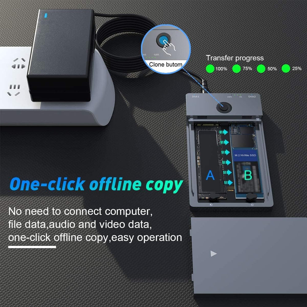- 1,702 / 5,000 【Offline-Kloner mit einer Taste】Ein einfacher Klon, kein Computer erforderlich. Schliessen Sie einfach die beiden M2.NVME-SSDs an und schalten Sie sie ein. Klicken Sie 3–5 Sekunden lang auf die Schaltfläche „Klonen“, um alle