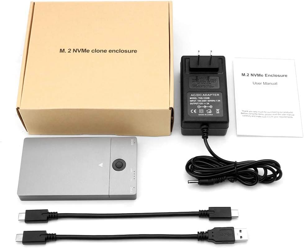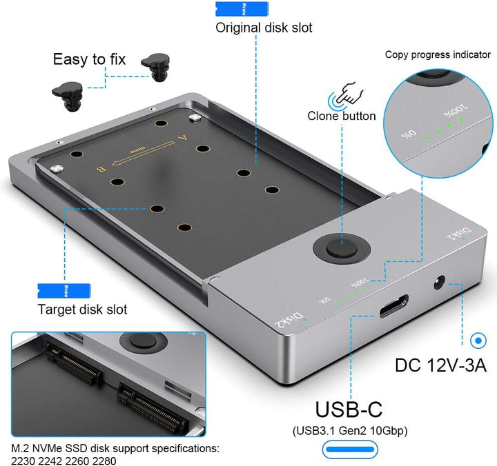 - 【Warme Tipps】 Dieser NVMe-Duplikator unterstützt zwei M.2 NVMe-SSDs mit M- und B&M-Schlüsseln (2230, 2242, 2260, 2280). SATA wird NICHT unterstützt. Achten Sie bei Verwendung des Offline-Klon-Duplikators darauf, dass die Kapazität der