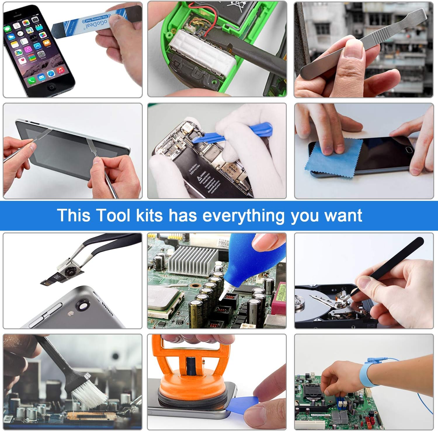 - 3. Stabiles und voll ausgestattetes Set mit Beschriftungen zur einfachen Aufbewahrung. Enthält auch spezielles Aufbrechwerkzeug, antistatische Pinzette, Saugnäpfe, rutschfeste Silikongriffe, Speichermatte verschrauben, antistatisches Handgelenkband, ,