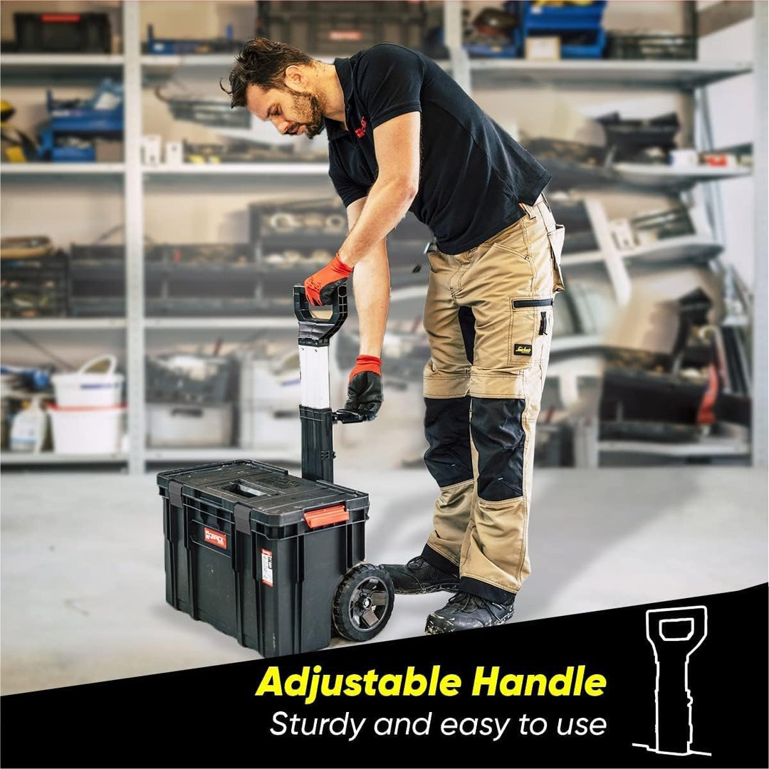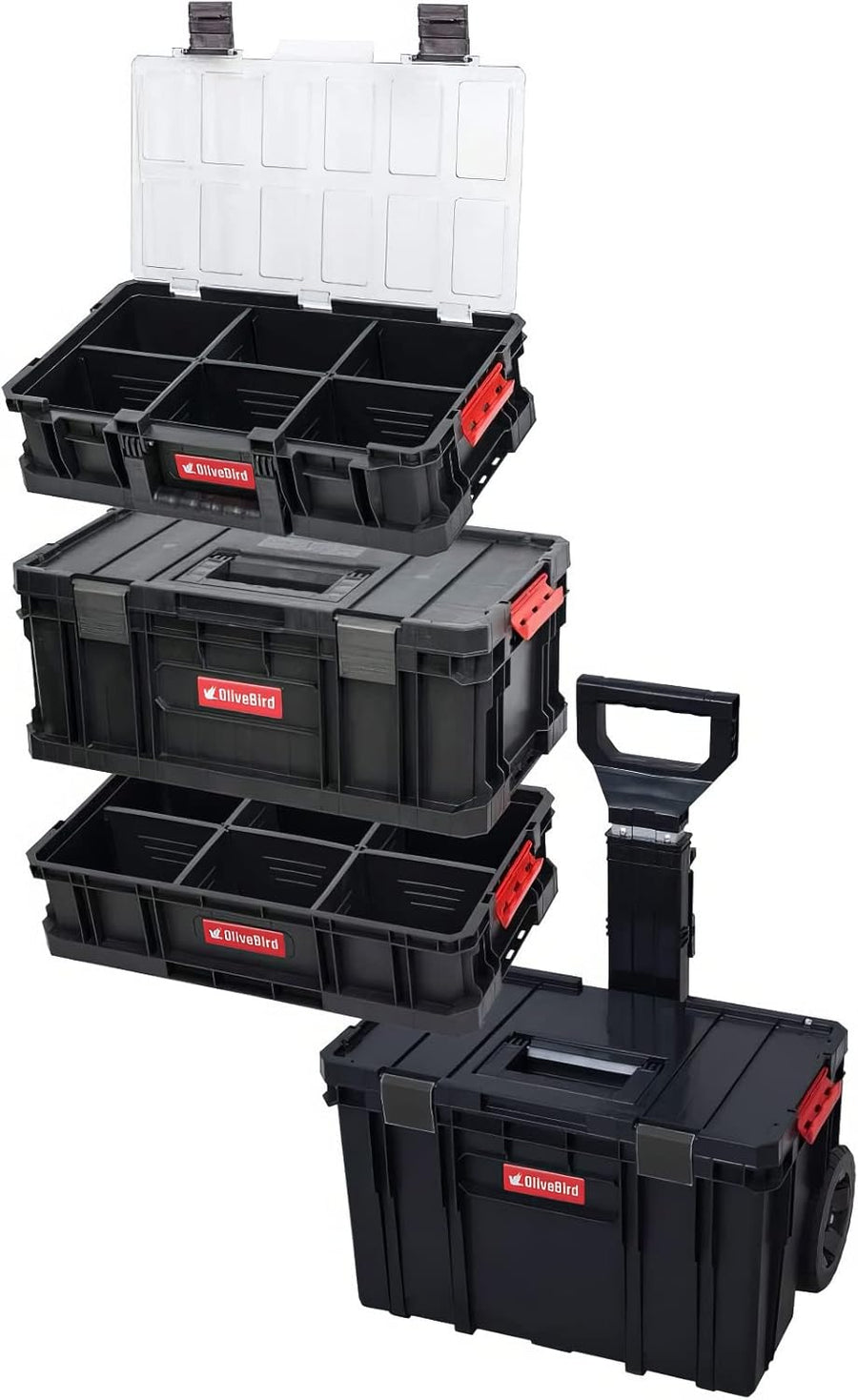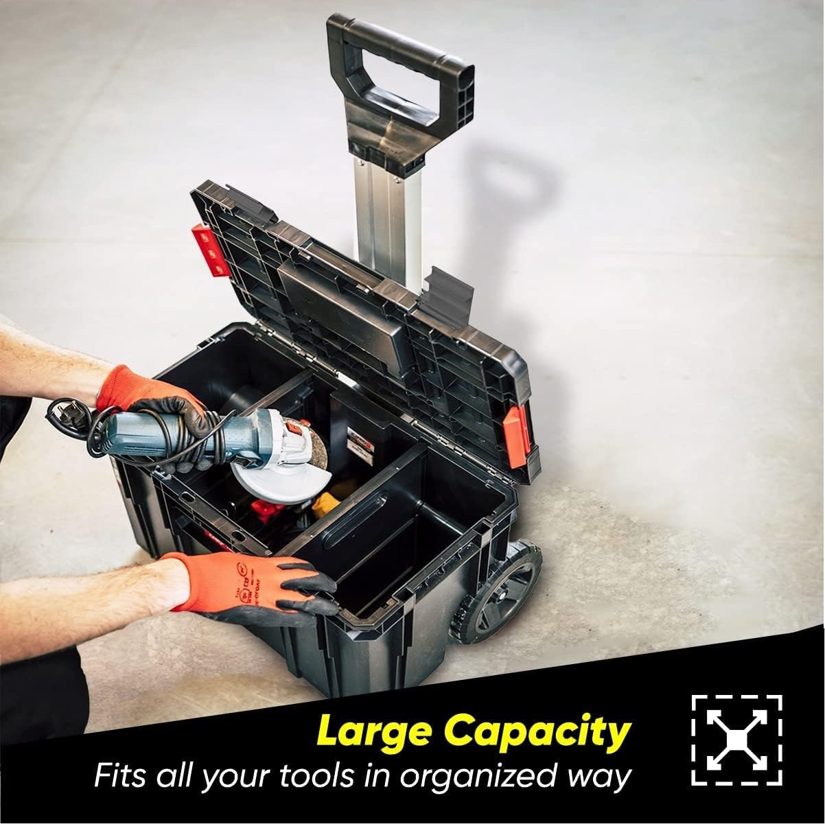 - Werkzeugkoffer-Set auf Rollwagen für die Aufbewahrung und den Transport von Werkzeugen in der Werkstatt. ToolBox Werkzeugkoffer - ein grosser Werkzeugkoffer mit Griff am Deckel und herausnehmbaren Fächern, ideal für Multi Organizer, Elektrowerkzeuge