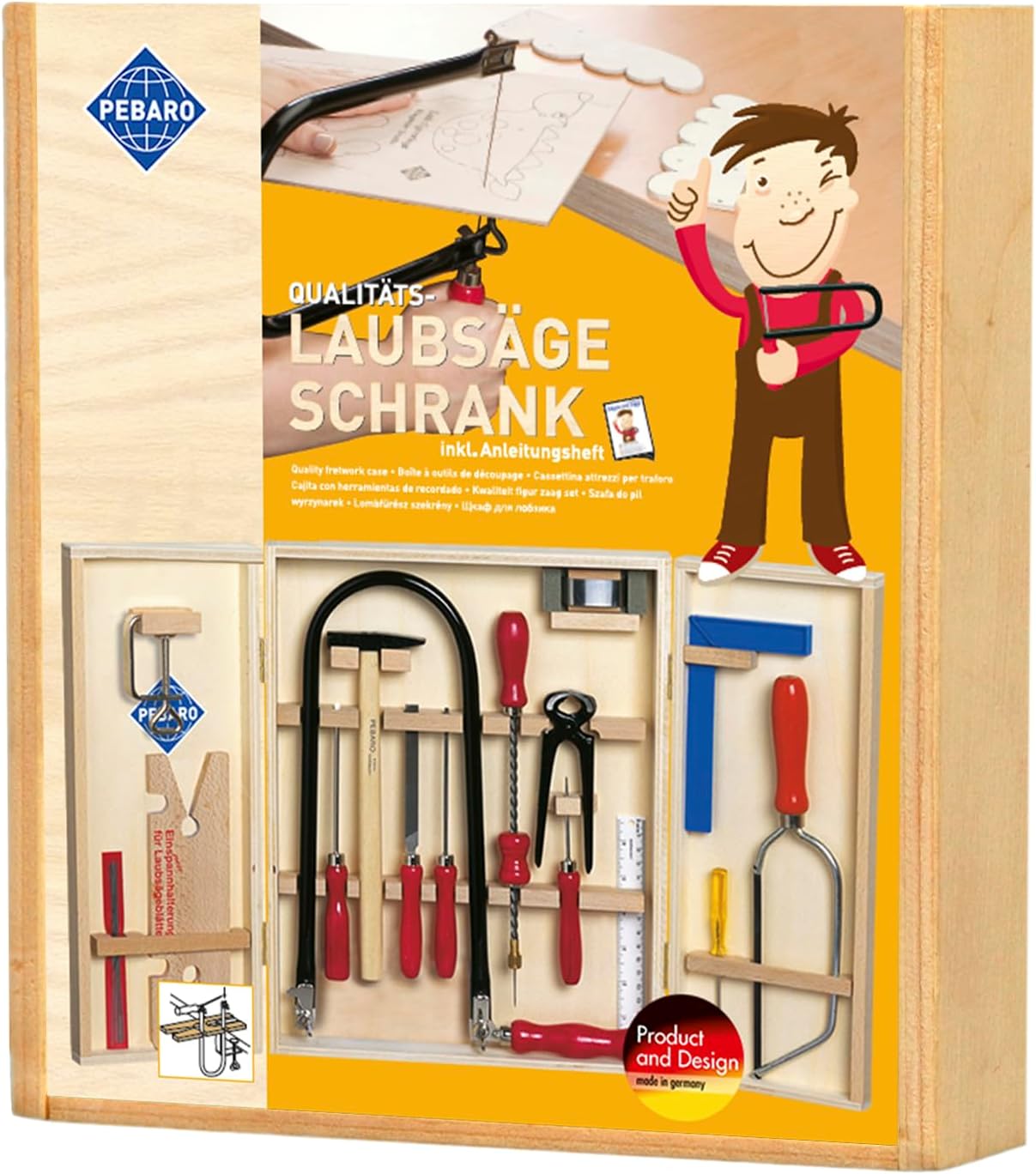 - KOMPLETTES SET Laubsäge im Holzschrank mit Stahlwerkzeugen und hochwertiger Säge