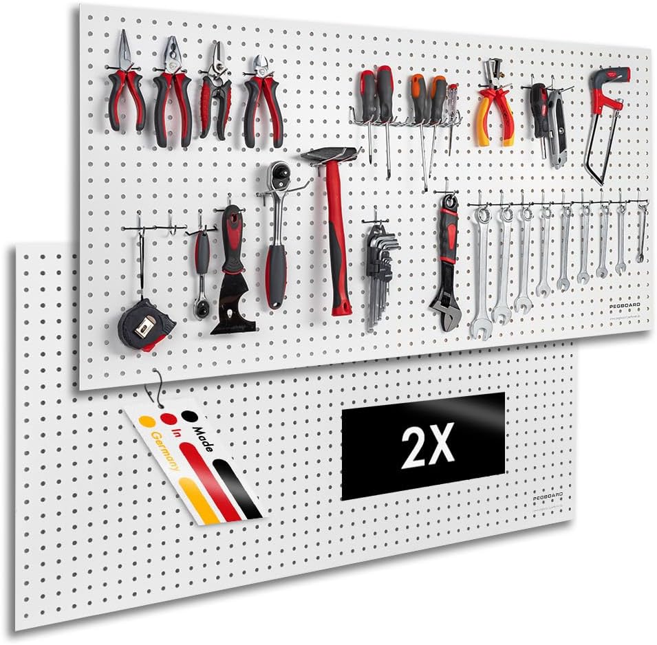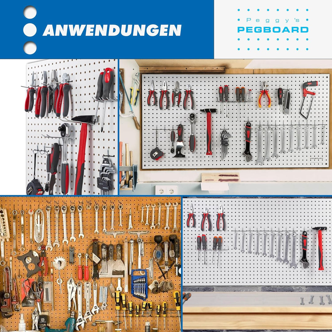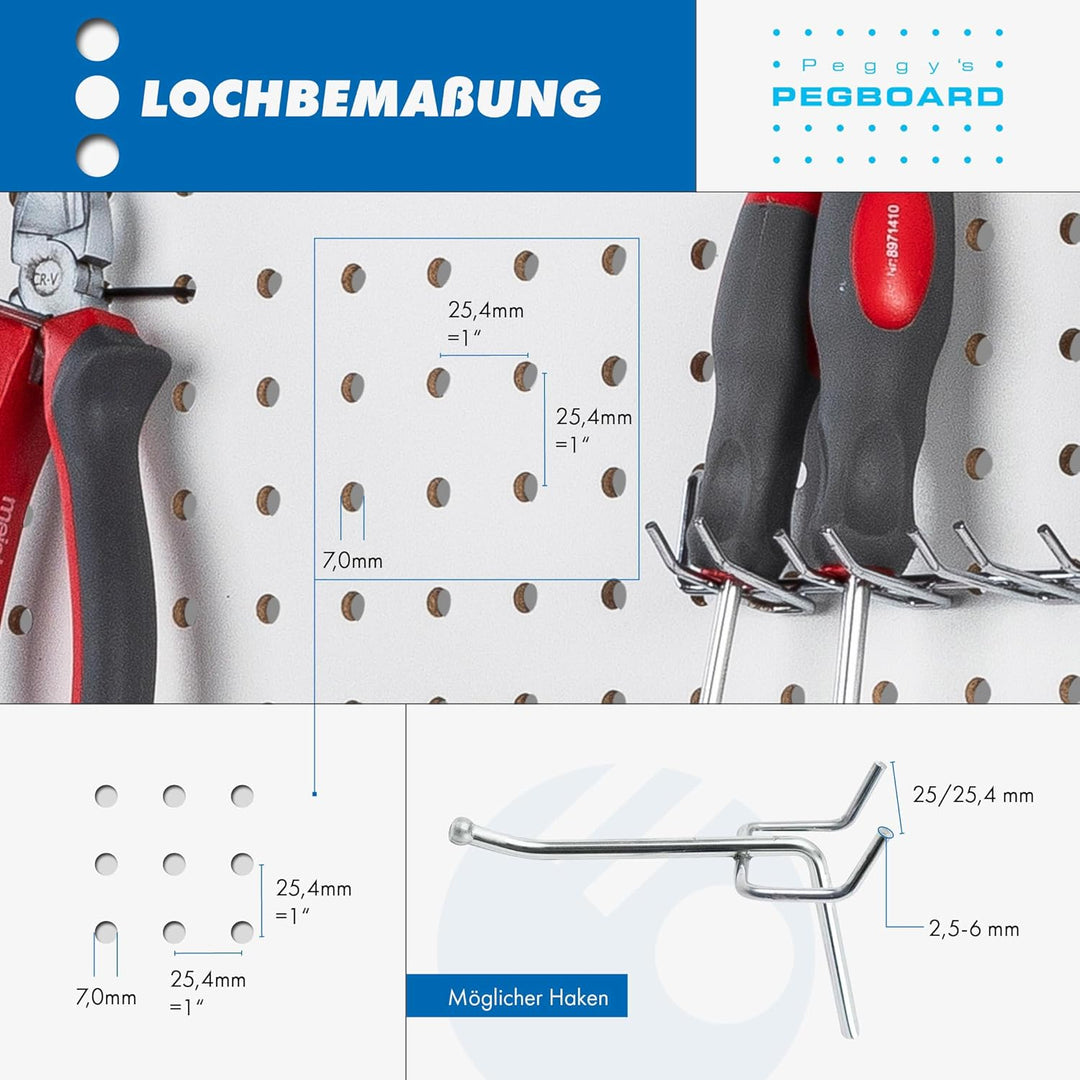 - Rasterlochung mit Ø7 mm und Lochabstand von 25,4 mm. Passend für Lochwandhaken mit Abstand von 25,4 mm oder 25 mm
