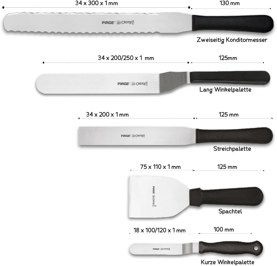 - INHALT DES SETS: Creme Konditormesser 30 cm / Creme Lang Winkelpalette 20-25 cm / Creme Kurze Winkelpalette 10-12 cm / Creme Streichpalette 20 cm / Creme Spachtel 11 cm / Pirge Rolltasche