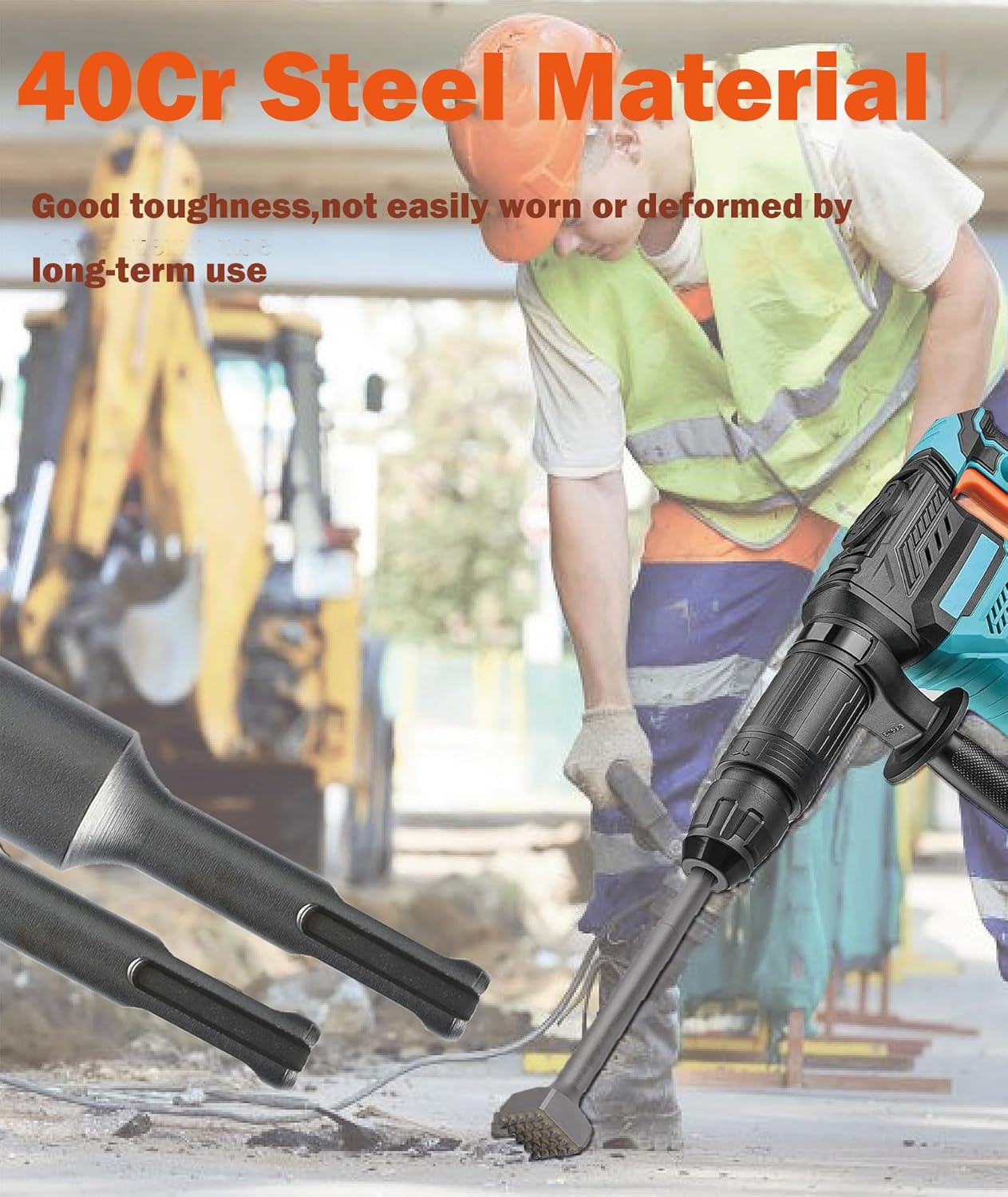 - Hochwertiges Material: Elektrischer Hammermeissel besteht aus hochwertigem 40Cr-Stahlmaterial, das eine gute Zähigkeit aufweist und nach längerem Gebrauch nicht leicht zu tragen oder zu verformen ist. Die Legierung ist fest verschweisst, schlag- und
