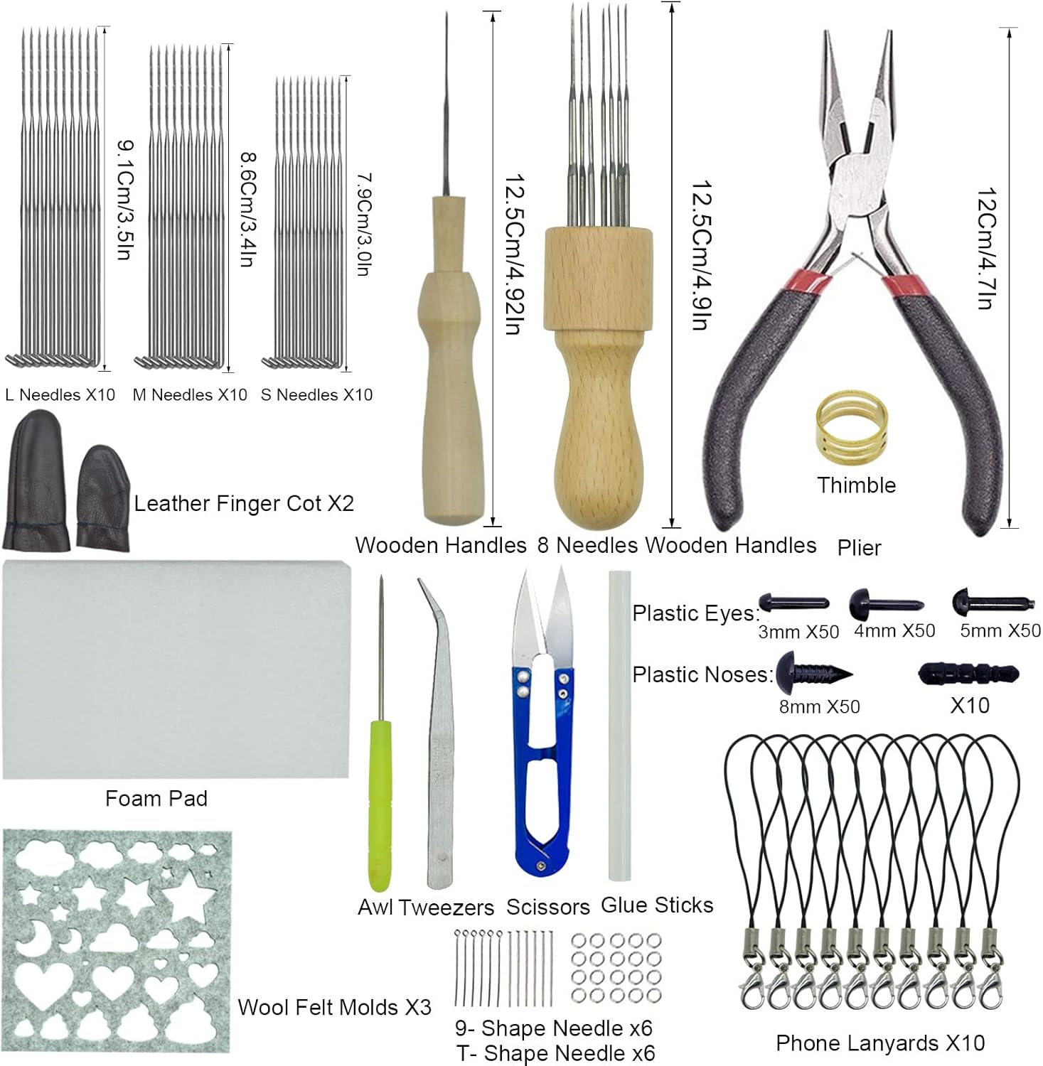 - Komplette Nadelfilz Set Werkzeuges: 150x Kunststoffaugens (3 mm/4 mm/5 mm), 50x Kunststoffnasens, 39x Filznadelns,1x Holzfilzgriff, 1x Holzfilzgriff mit 8 Nadelfilzens, 20x T-förmige Nadelfilzens, 20x 9-förmige Nadelfilzens, 20x Metallrings, 10x Handy