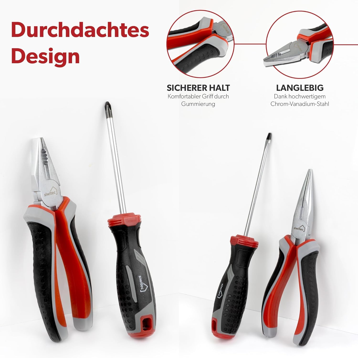 - ERGONOMISCHES DESIGN: Durch die Form der roten Griffe und die schwarz-graue Gummierung liegen die Werkzeuge besonders gut in der Hand und haben einen optimalen Halt.