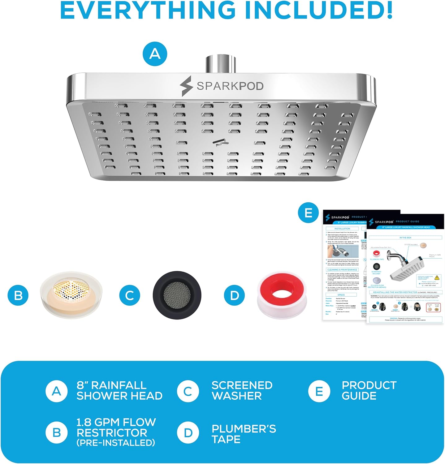 - ENERGY SAVINGS: Each SparkPod Rain Shower Head has a maximum outflow of 1.8 gallons per minute (GPM) so you can save on your water heater bill or ENJOY longer hot showers