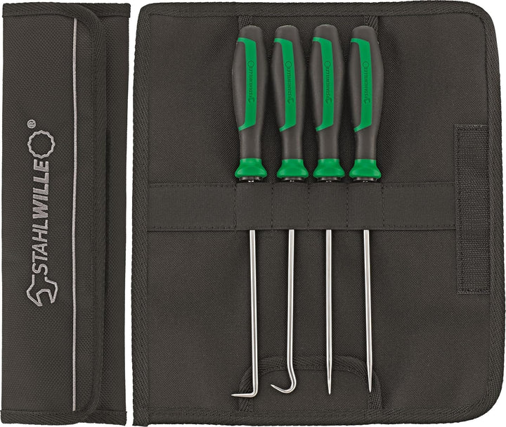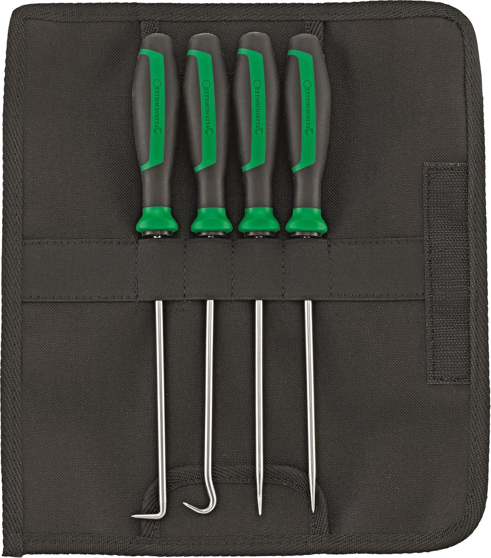 - 4-teiliger Satz mit extra langen Hakenwerkzeugen zur Montage und Demontage von Kleinteilen wie Simmer- oder O-Ringen, Dichtungen oder Verkleidungen.