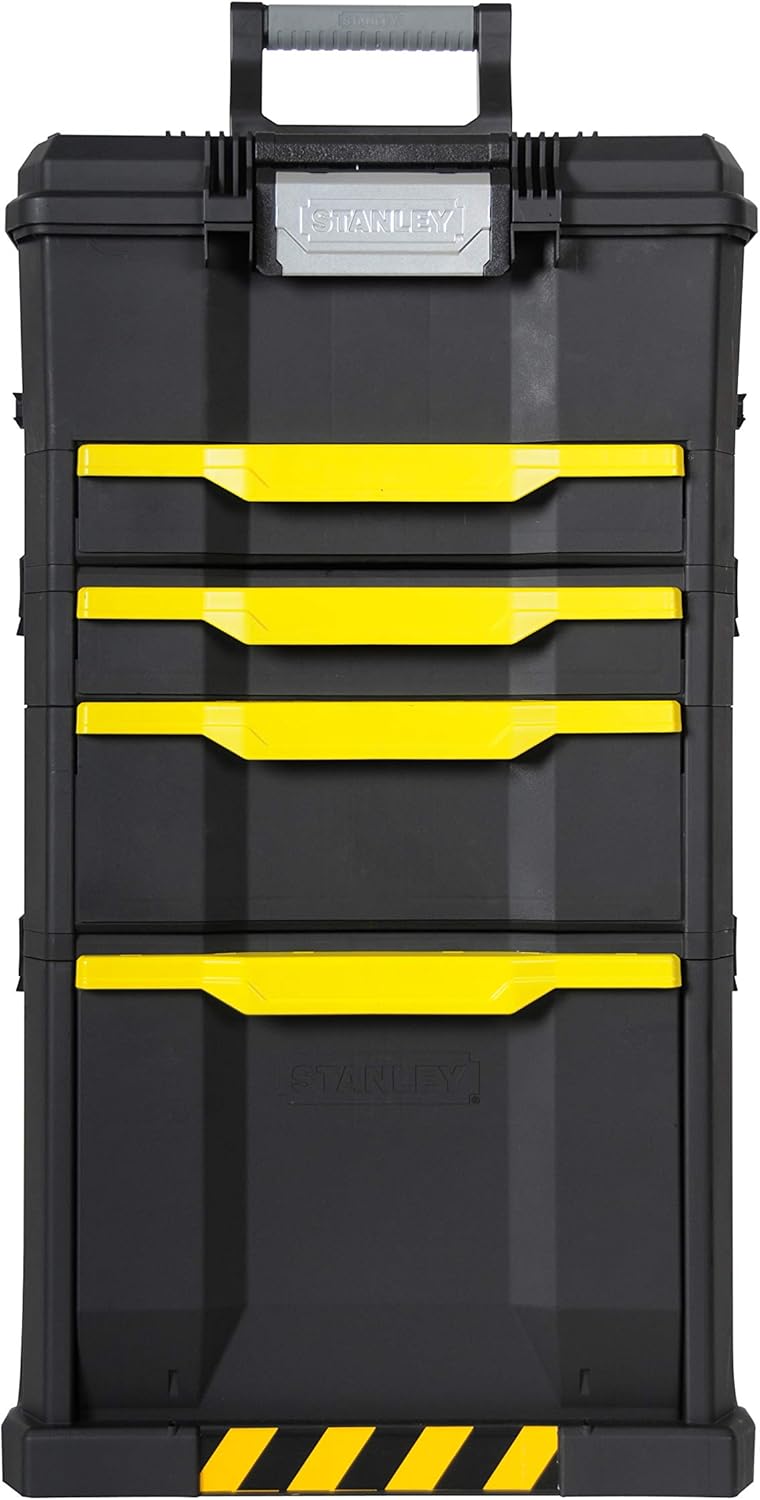 - Der Stanley Werkzeugtrolley ist mit 3 Werkzeugboxen modular aufgebaut / Integriert sind 2 Schubladen, ein grosses herauskippbares Staufach und 2 Fächer an der Rückseite für längere Werkzeuge