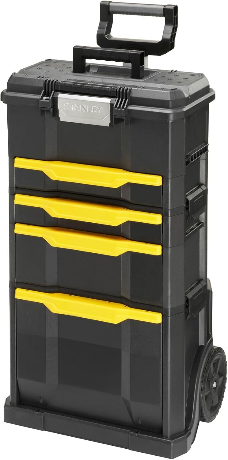 - Der Stanley Werkzeugtrolley ist mit 3 Werkzeugboxen modular aufgebaut / Integriert sind 2 Schubladen, ein grosses herauskippbares Staufach und 2 Fächer an der Rückseite für längere Werkzeuge