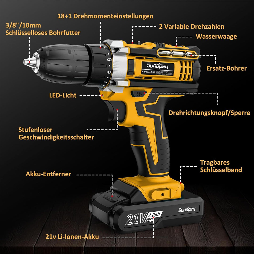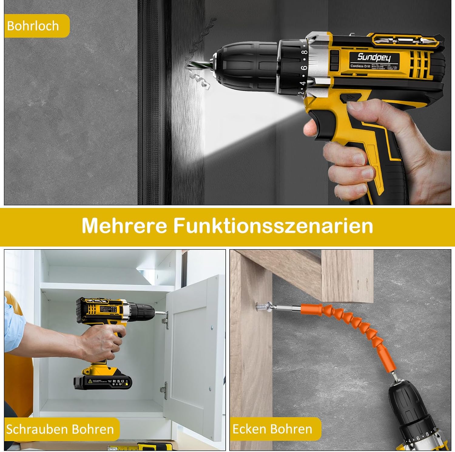 - Zwei 2.0ah-Batterien und Konformes LadegeräT: Das Frustrierendste für häufige Heimwerker ist, wenn der Bohrmaschine plötzlich der Strom ausgeht, so dass Sundpey die Bedürfnisse der Kunden mit zwei 2.0AH-Kapazitätsbatterien voll respektiert, jede