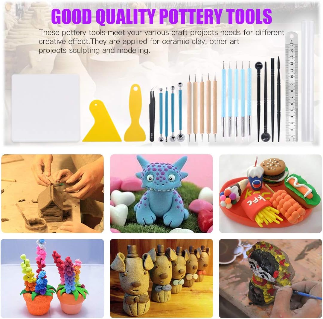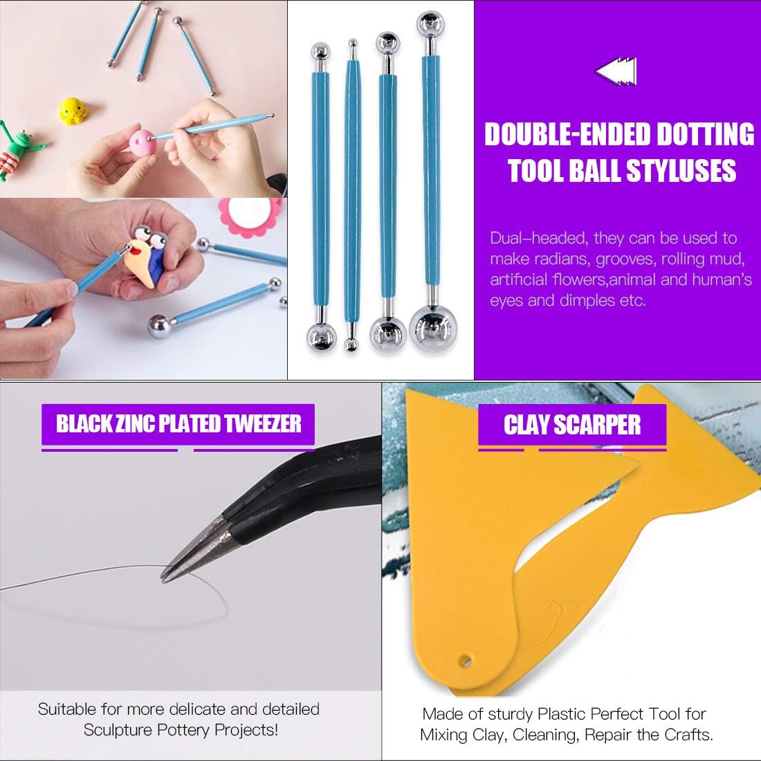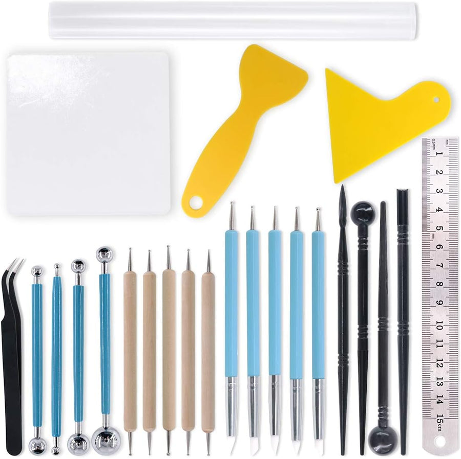 - Lieferumfang: 24-teiliges Modellierwerkzeug-Set, darunter 5 Holz-Punktierwerkzeuge, 5 doppelseitige Design-Töpferwerkzeuge, 4 Kunststoff-Kugel-Stab-Stylus-Modellierwerkzeuge, 4 Kugel-Stifus-Modellierwerkzeuge, 1 Acryl-Backbrett, 1 Tonrolle, 2