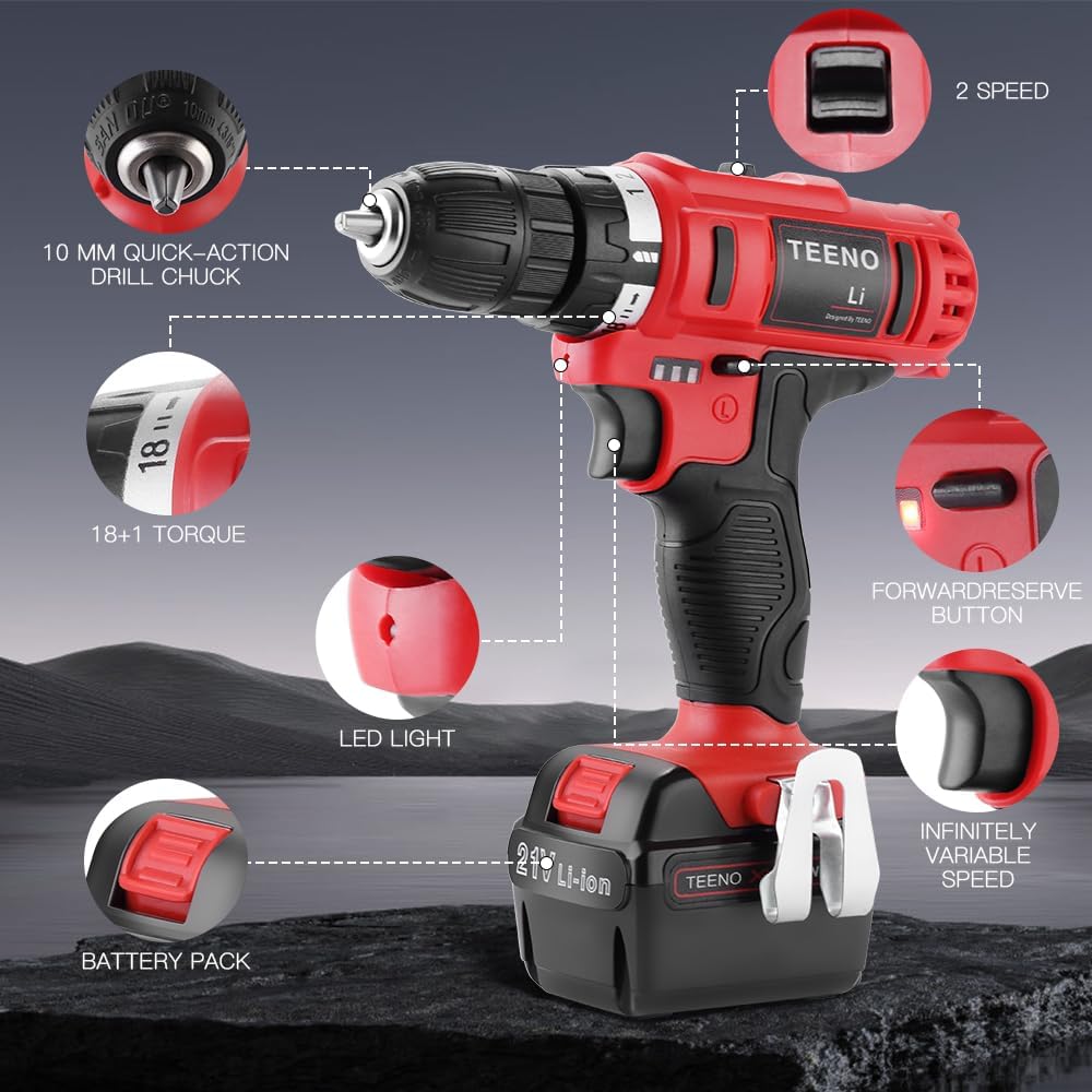 - Bessere Nutzung mit Batterien – leistungsstarke und widerstandsfähige 21 V Lithium-Batterien mit 1,5 Ah, Schnellladung in 1 Stunde, 18 + 1 Stufen zur Einstellung des Drehmoments