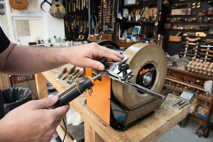 - Horizontale Aufnahmen für Tragarme helfen beim Aufrechterhalten des optimalen Schleifwinkels beim Honen von Schneiden
