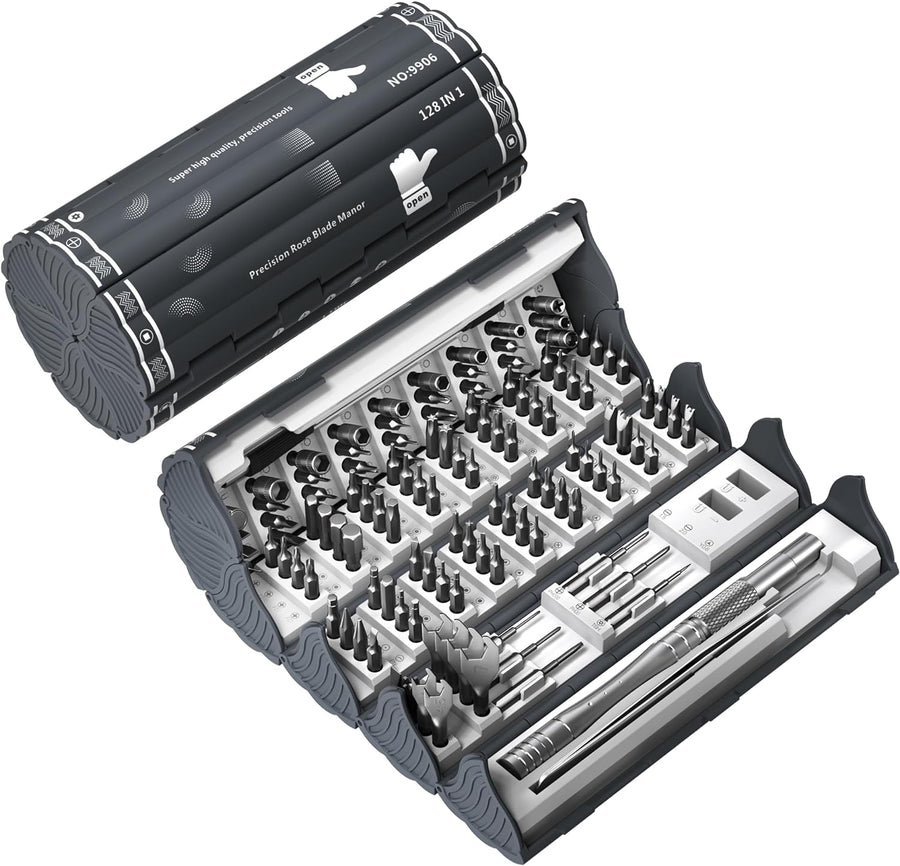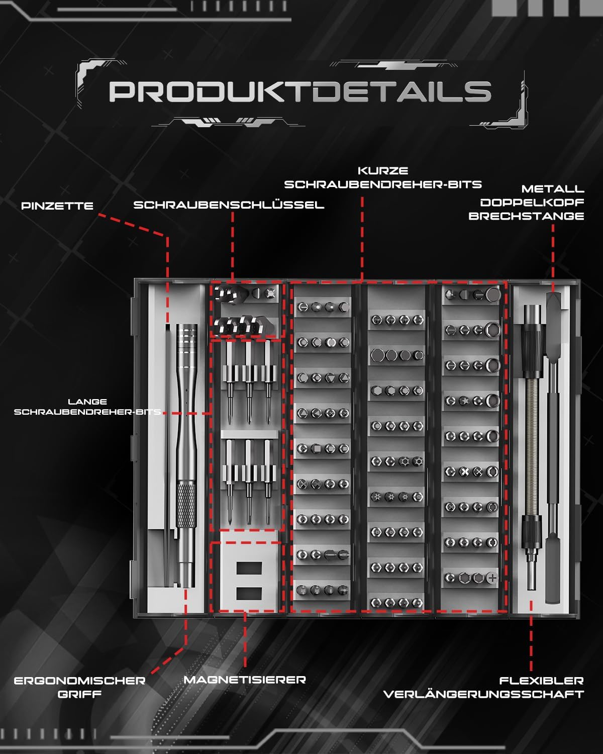 - 【Vielseitigkeit in einem Set】Das 128-in-1 Feinmechaniker Werkzeug Set enthält 122 hochwertige Bits sowie 6 unverzichtbare Werkzeuge, darunter einen Schraubendrehergriff, eine Verlängerungsstange, einen Magnetisierer, einen Entmagnetisierer,