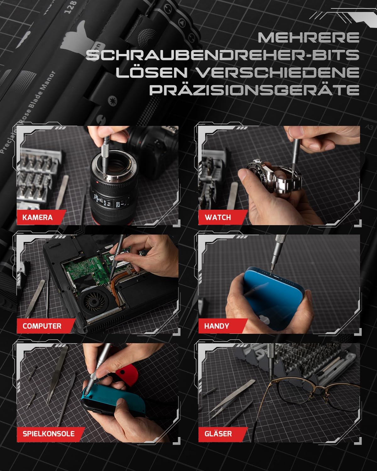 - 【Praktisches Reparaturwerkzeug】Dieses Feinwerkzeug Set ist speziell darauf ausgelegt, Ihre Reparaturfähigkeiten zu maximieren. Es enthält verschiedene Wartungszubehörteile wie einen ergonomischen, gummierten Aluminiumgriff mit 360° drehbarem Kopf