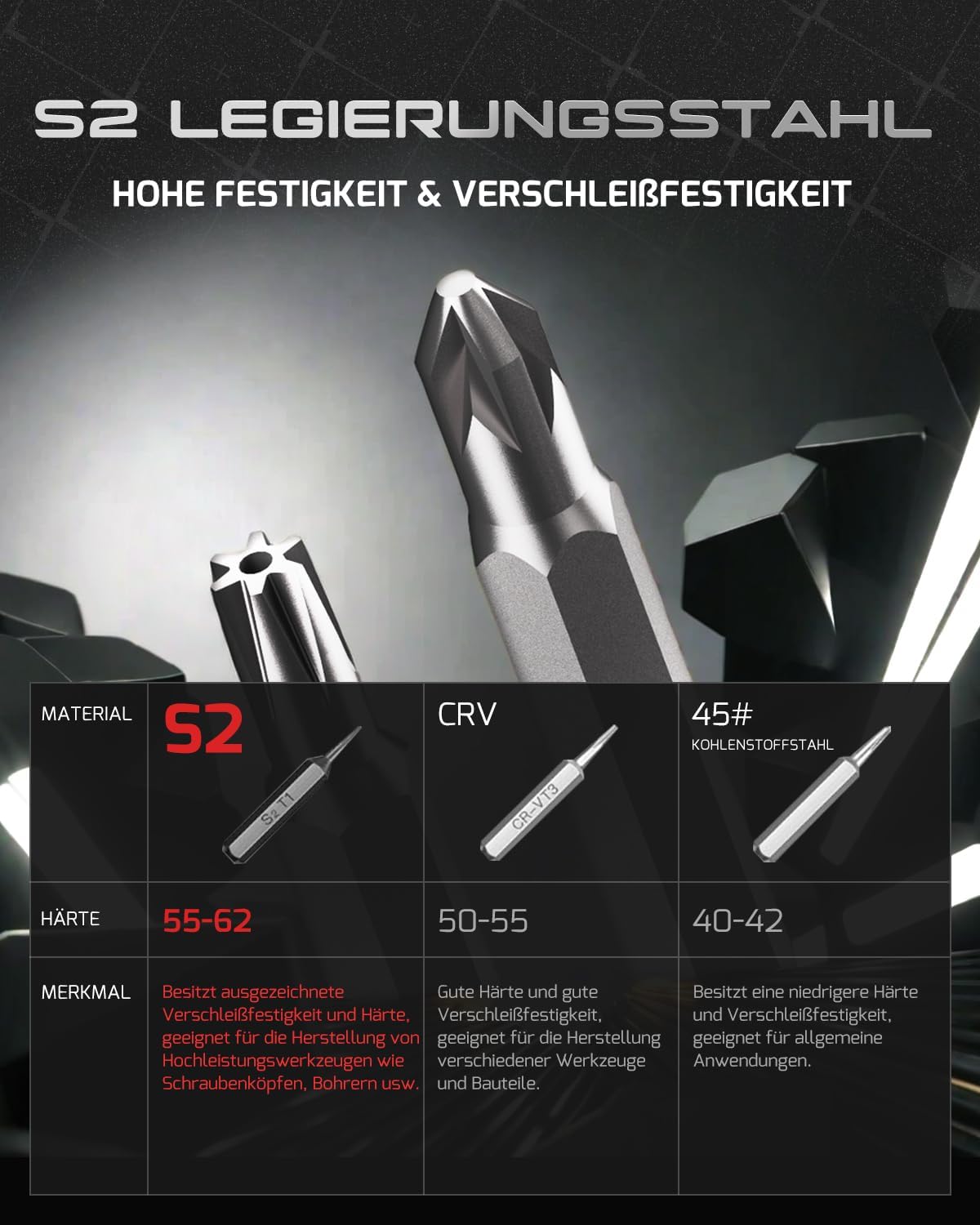 - 【Hochwertige, langlebige Bits】Die Bits bestehen aus hochwertigem S2-Stahl und sind wärmebehandelt, um eine Härte von über HRC62° zu erreichen, was sie besonders robust und langlebig macht. Ersatzbits für gängige Typen wie Phillips, Schlitz und