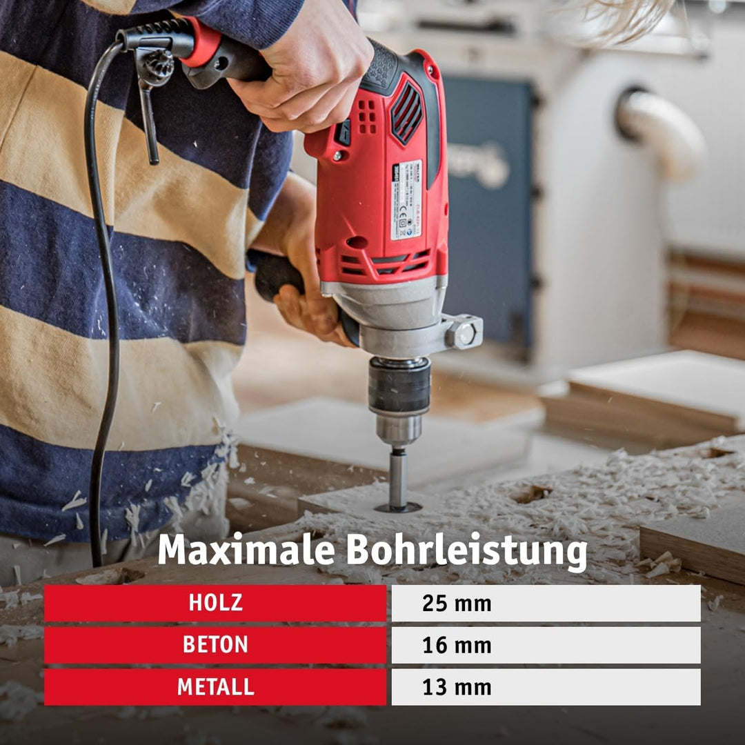 - Vielseitige Anwendungsmöglichkeiten: Mit maximalen Bohrdurchmessern von 25 mm in Holz, 16 mm in Beton und 13 mm in Metall ist diese Schlagbohrmaschine ein echter Allrounder für verschiedenste Projekte.