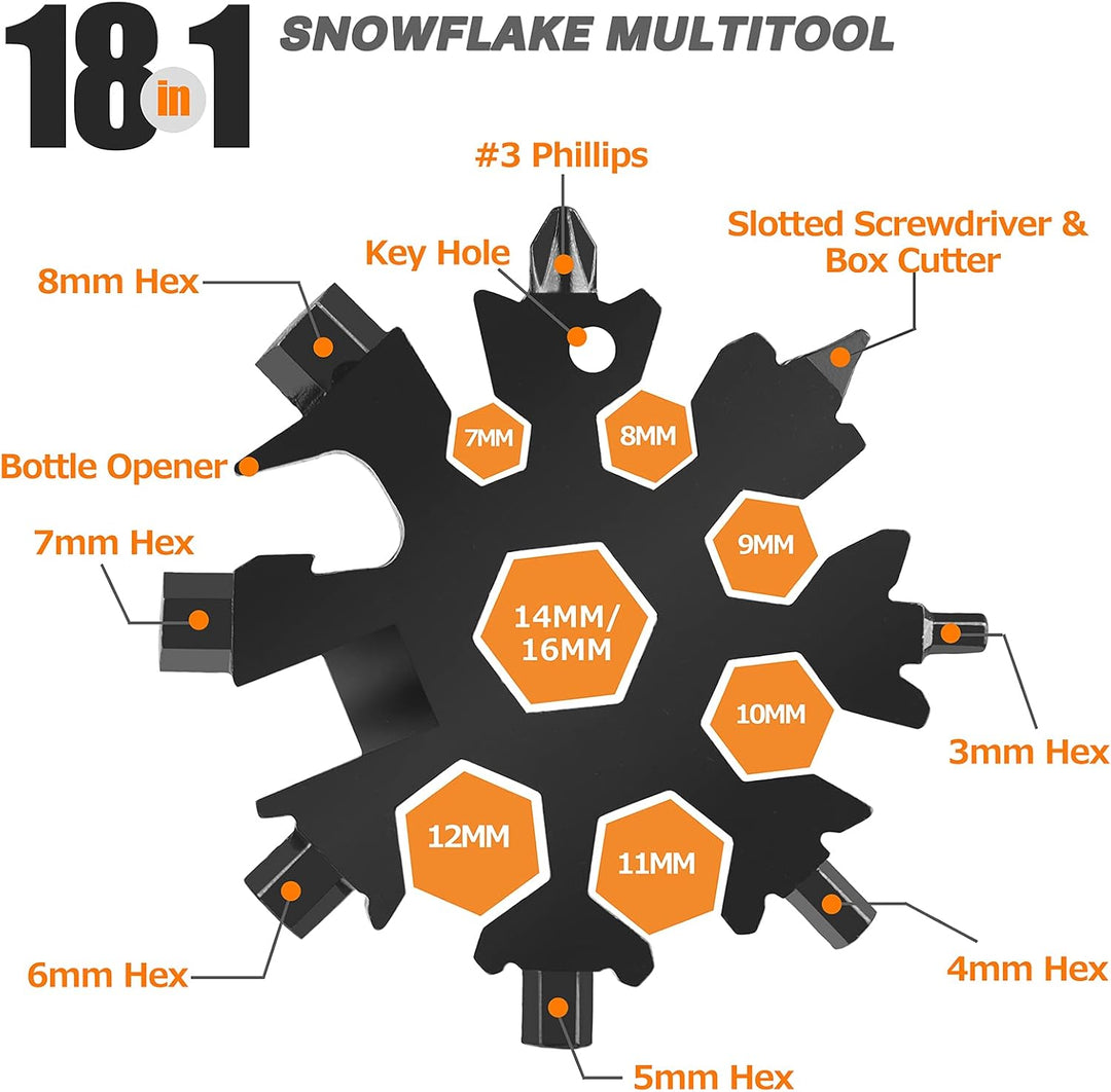 - 【Leicht zu Tragen】Das Schneeflocken Multitool kann an einem Schlüsselring oder in Rucksack befestigt werden. Die Grösse von Schraubenschlüssel Multi-Tool beträgt nur 16 cm mit einer tragbaren Nylon Hülle, es ist sehr bequem zu tragen. Sie kann