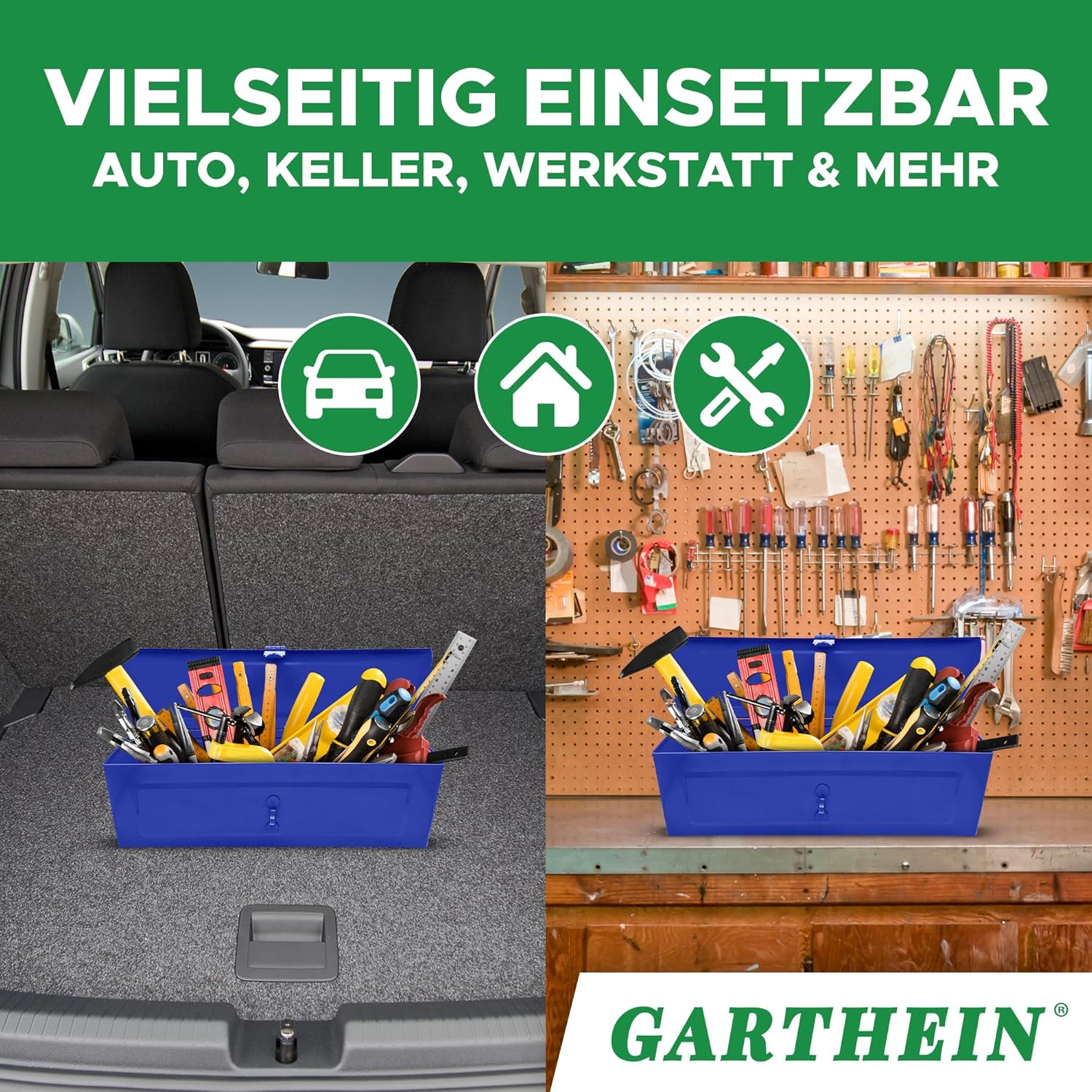 - Werkzeugkiste in Blau: Die GARTHEIN Werkzeugkiste in Blau bietet eine stabile und sichere Aufbewahrung für Werkzeuge. Ideal für Heimwerker, Mechaniker & Profis, die ihre Ausstattung geordnet verstauen möchten. Perfekt für die Nutzung in der