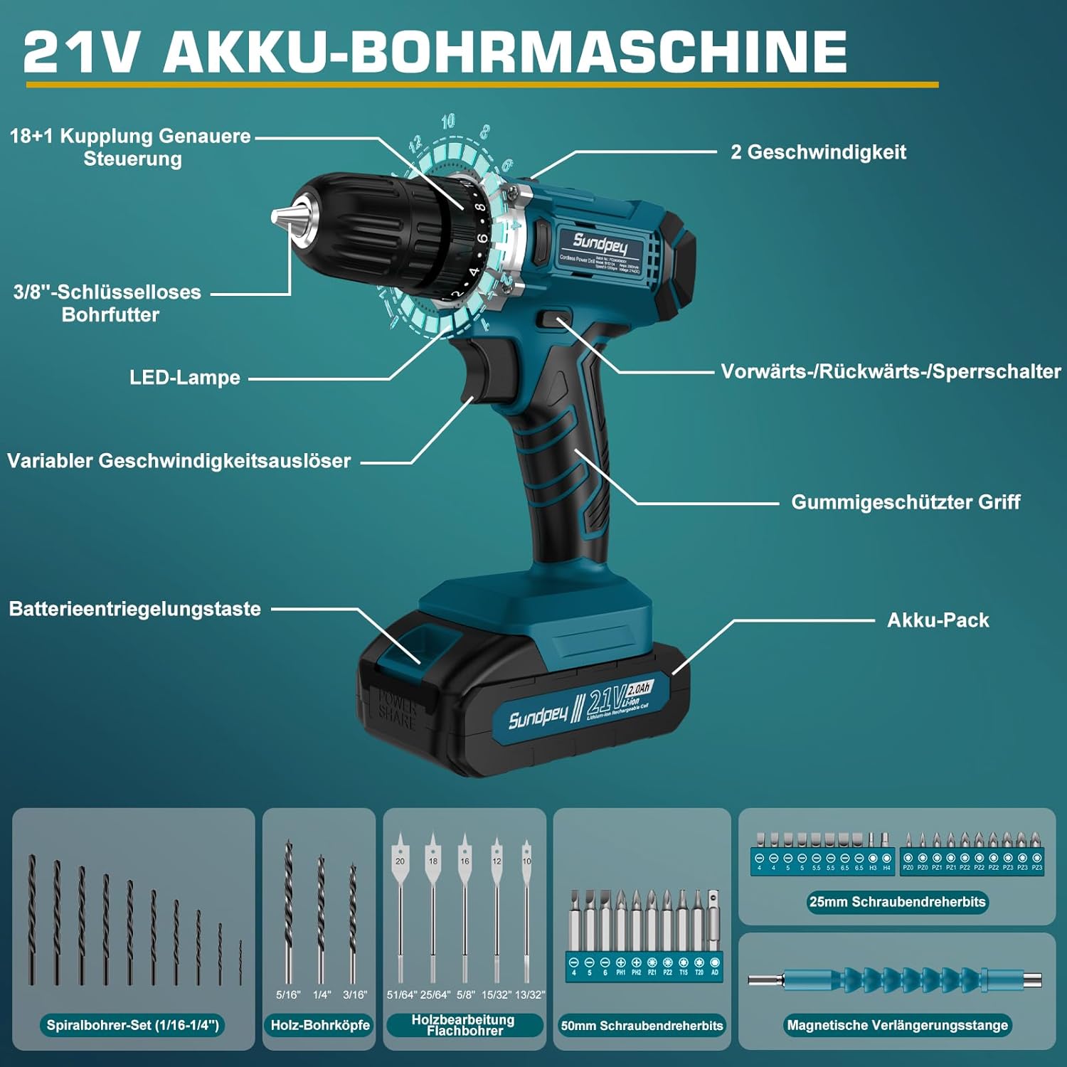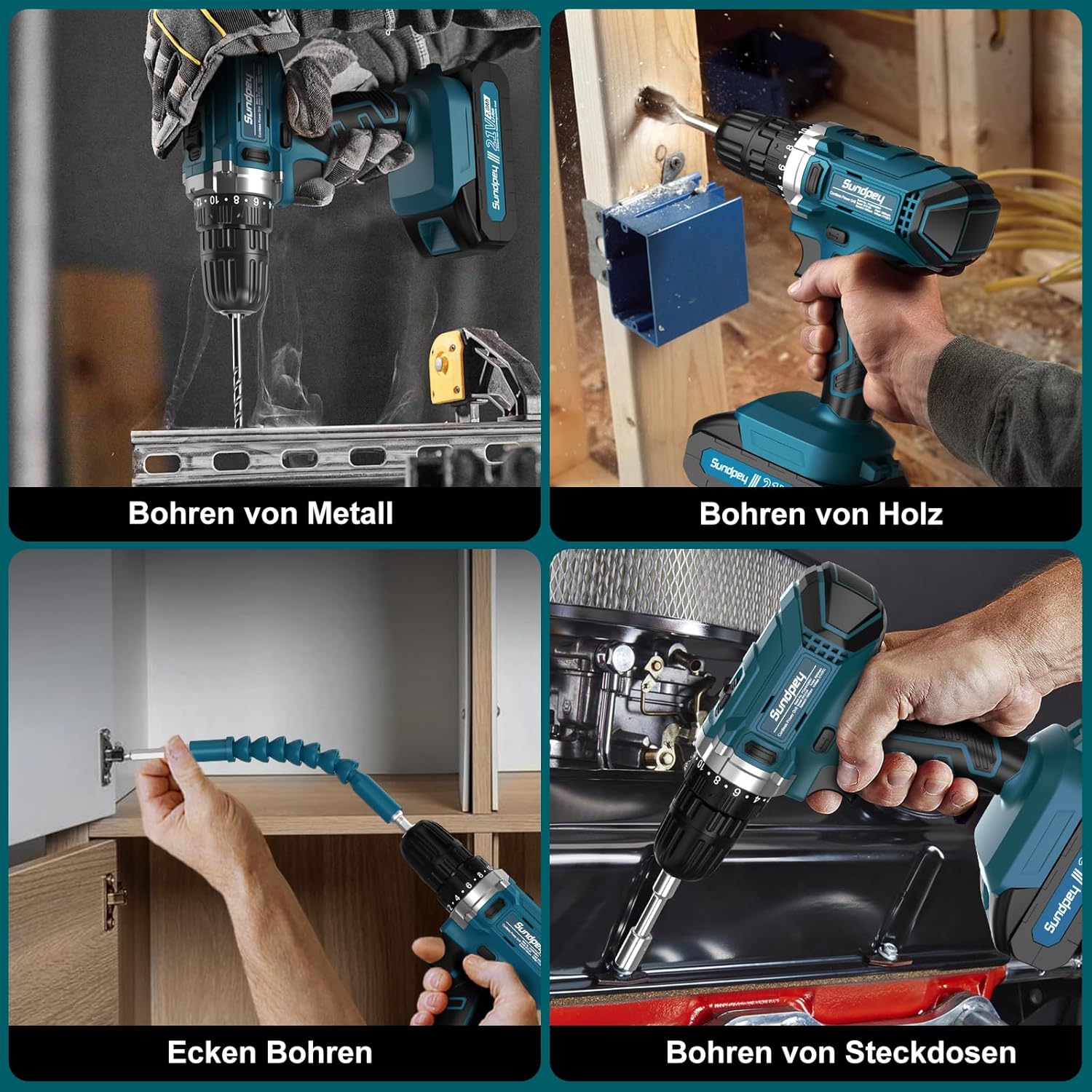 - 21V Akku Bohrschrauber mit LED: Der Sundpey 21V akku schlagbohrschrauber ist vielseitig einsetzbar. Der akkuschrauber Combo Kit kann Schrauben festziehen und Löcher in Kunststoff, Holz, Keramik und Glas bohren. Die Maschine ist mit einer eingebauten