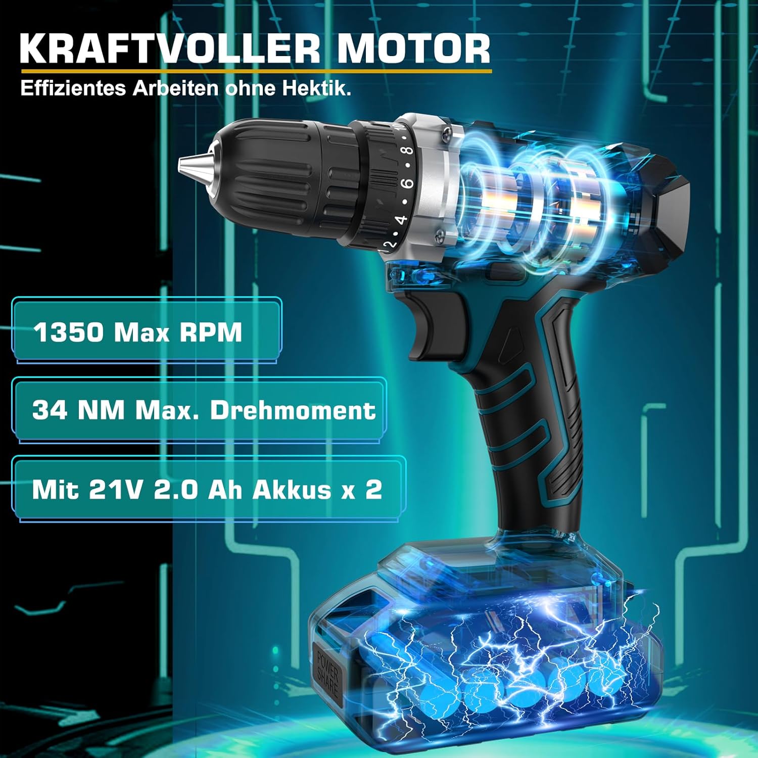 - Doppelte Akkulebensdauer & Längere Laufzeit: 21V akku bohrschrauber ist mit zwei 2.0 Ah Lithium-Ionen Akkus ausgestattet. Ein Akku ist in nur 1.5 Stunden vollständig aufgeladen und kann ca. 1 Stunde ununterbrochen verwendet werden. Jeder Akku ist klein