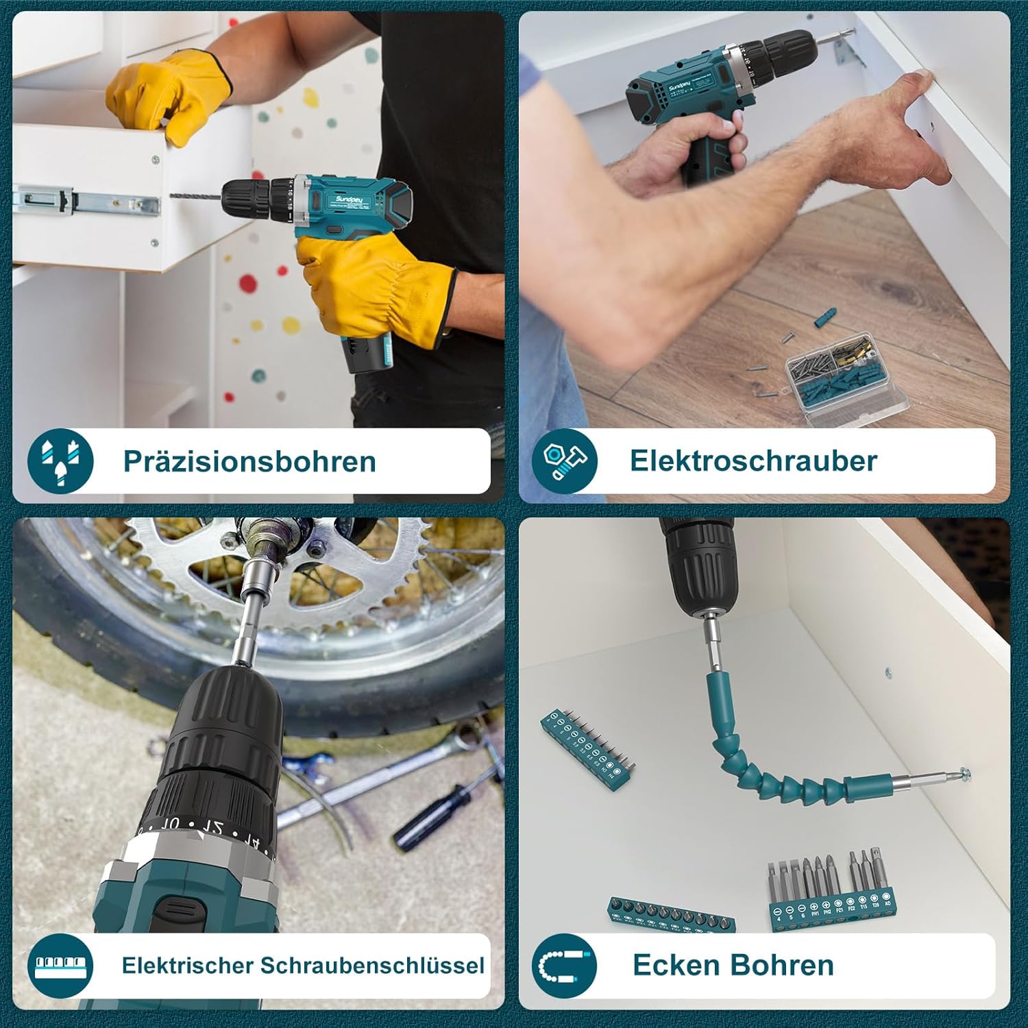 - 12V Akku-Bohrschrauber mit LED: Sundpey Akku Bohrschrauber (0-350 U/min, 0-1350 U/min) und 25+1 Drehmomentstufen. Mit einer grossen Auswahl an Bohrköpfen und Werkzeugen kann die 12V Bohrmaschine zum Bohren, Schrauben und für andere Aufgaben verwendet