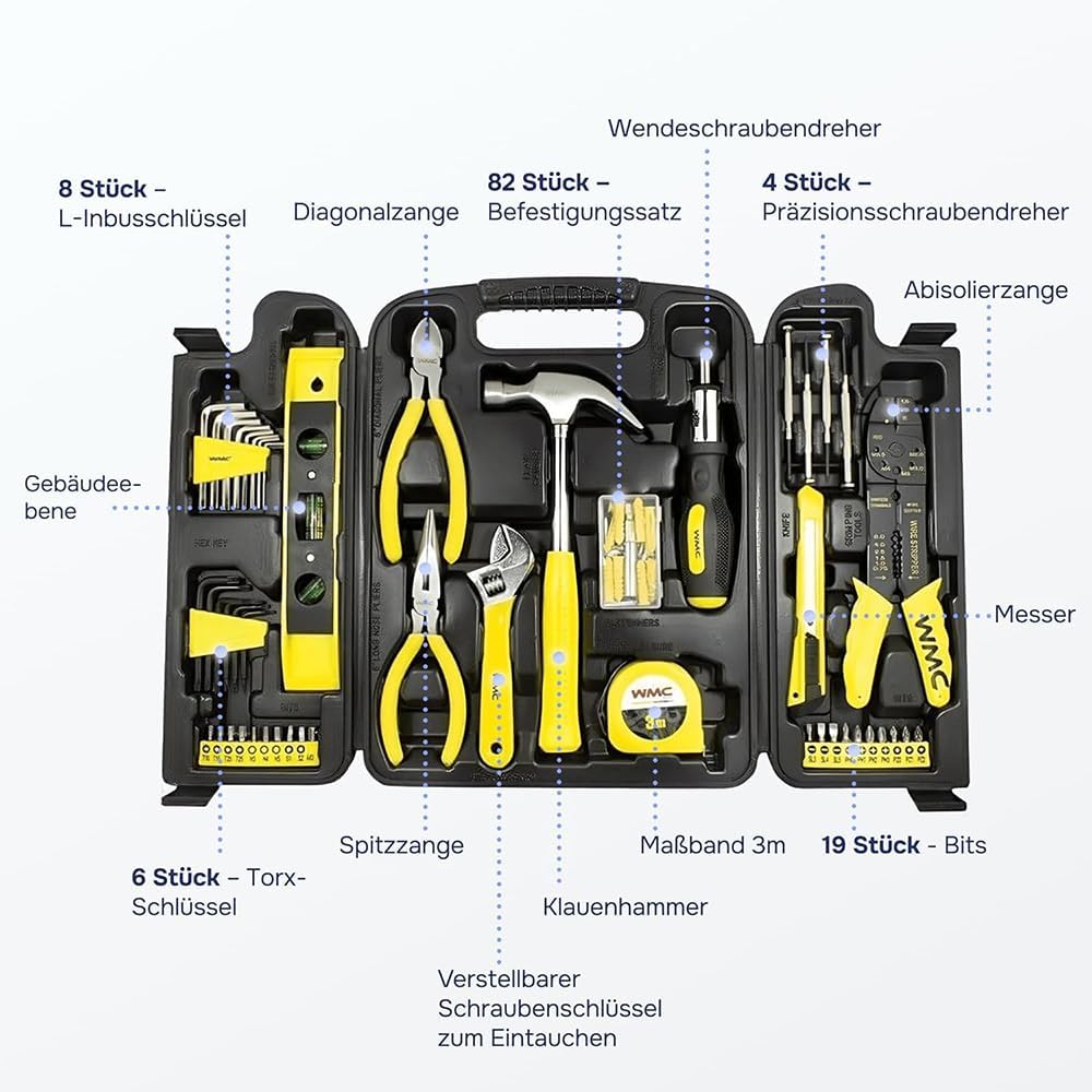 - 【Einfach und raffiniert】- Dieses praktische 130-teilige Set ist ein Muss für jeden, der ein Haus, Büro, Geschäft oder eine Wohnung besitzt oder mietet. Das Handwerkzeugset hat ein sauberes und innovatives Aussehen, und der Werkzeugkasten hat ein