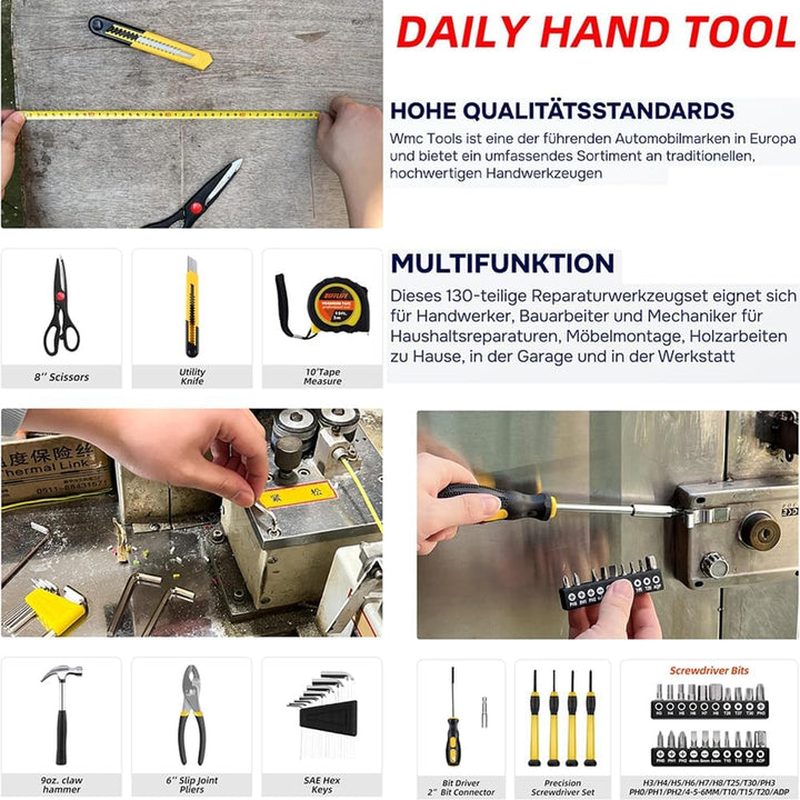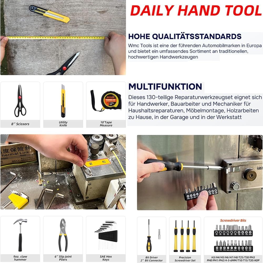 - 【Weiter Anwendungsbereich】 Dieser 130-teilige multifunktionale Werkzeugsatz ist perfekt für Autoreparaturen, Heimwerken, regelmässige Hauswartung und alltägliche Hausarbeiten. Alle grundlegenden Werkzeuge sind in diesem Kit für erfahrene