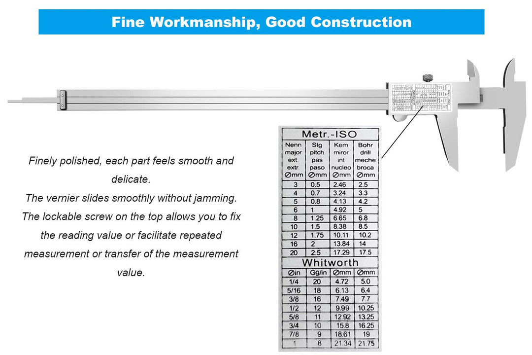 - Hergestellt aus gehärtetem Edelstahl, einem robusten grossen Messschieber, fein poliert, glatt und langlebig, korrosionsbeständig.