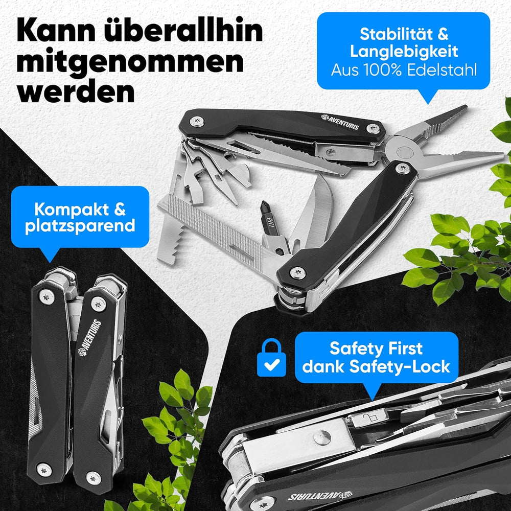 AVENTURIS® Multitool-Werkzeug aus Edelstahl mit 21 Funktionen, Geschenk für Mann, Multi tool mit Zan