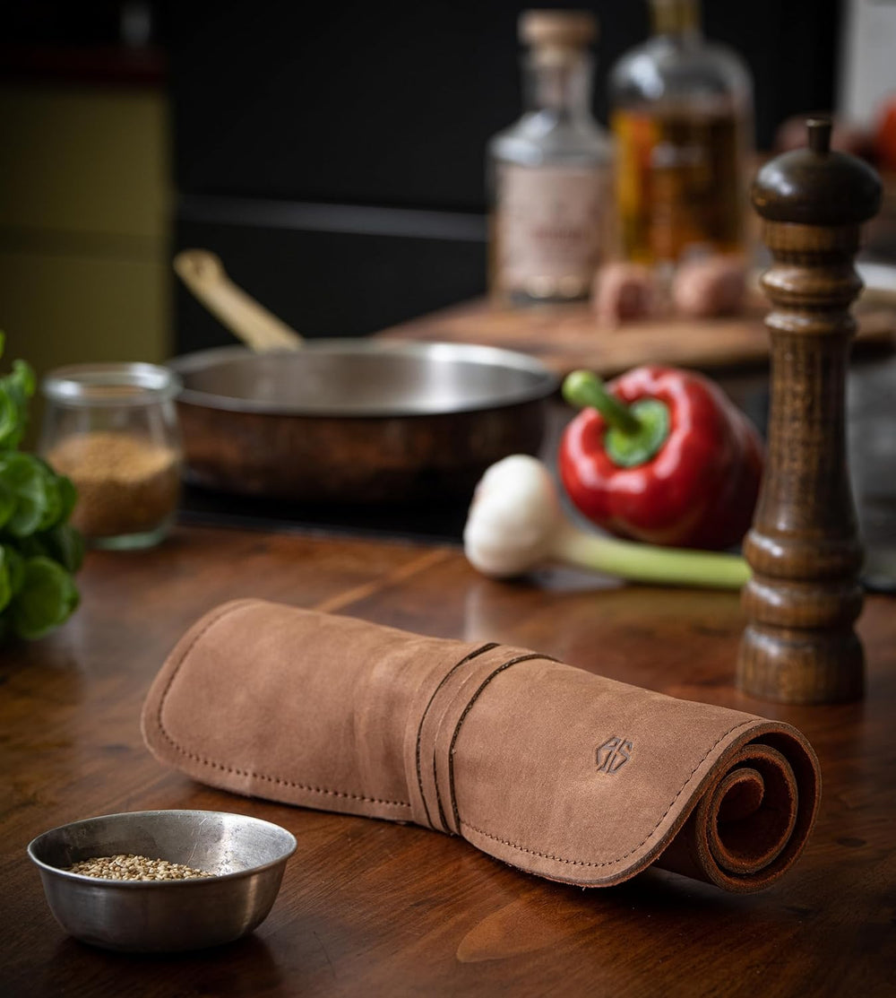 Angus Stoke Hochwertige 7-Fach Echt-Leder Kochmesserrolle Steve – Rolltasche Werkzeugtasche verschli