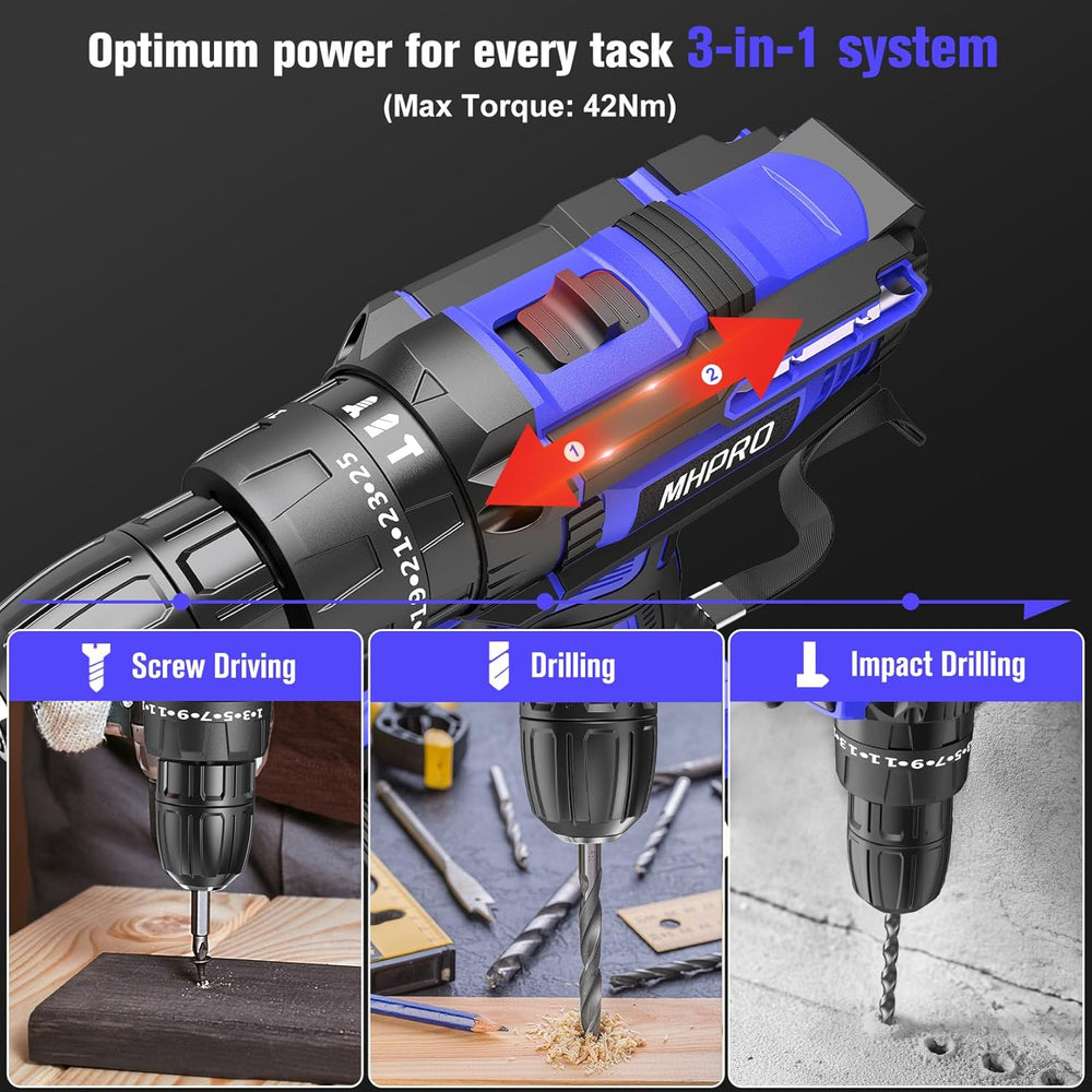 MHPRO Akkuschrauber 21V, Akku Bohrschrauber mit 2 Akkus 2.0Ah, 42Nm Akku Bohrmaschine, 2 Gang, 25+3