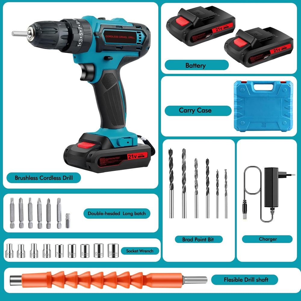 Akkuschrauber 21V Akku Bohrmaschine, 45Nm Akku-Bohrschrauber Set für DIY Projekt, 25+1 Drehmomentstu