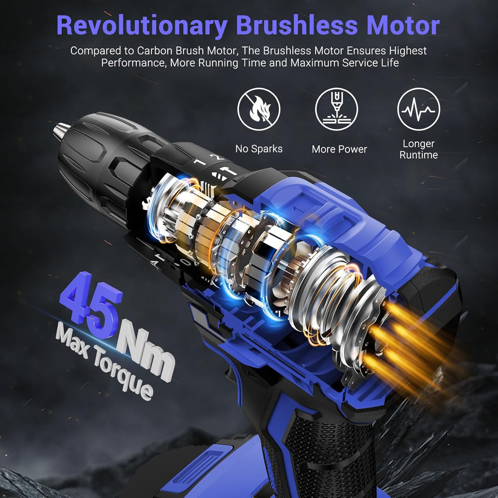 MHPRO Akkuschrauber Bürstenlos 21V, Akku Bohrschrauber mit 2 Akkus 2.0Ah, 45N.m Akku Bohrmaschine, 2