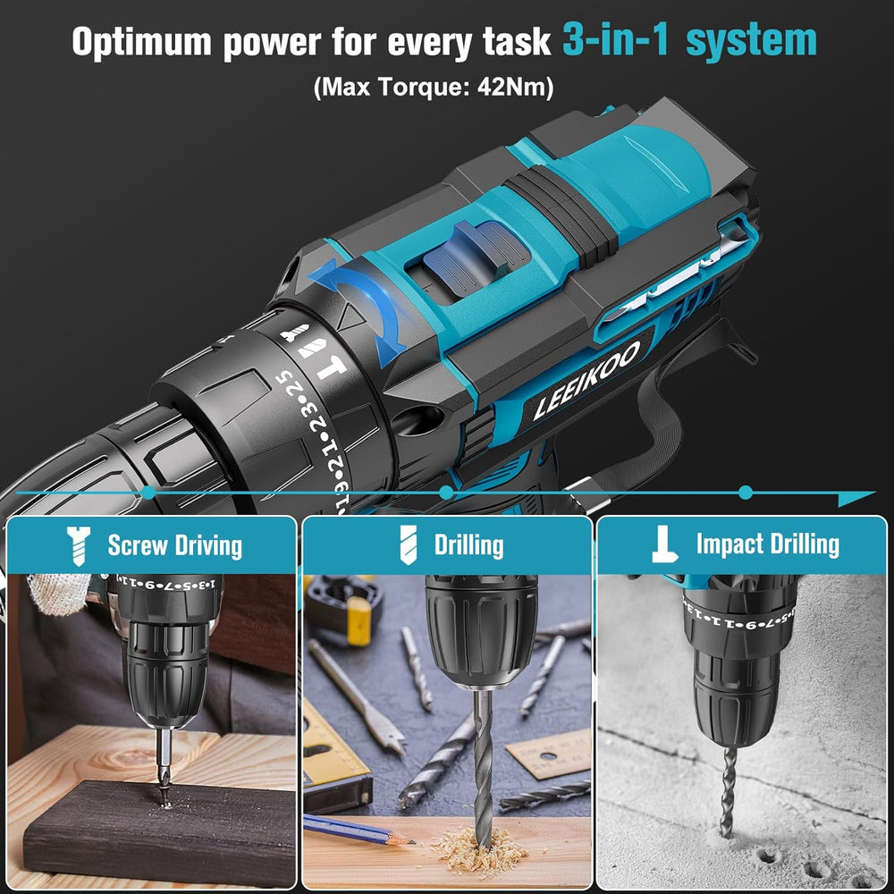 LEEIKOO Akkuschrauber 21V, Akku Bohrschrauber mit 2 Akkus 2.0Ah, 42N.m Akku Bohrmaschine, 25+3 Drehm