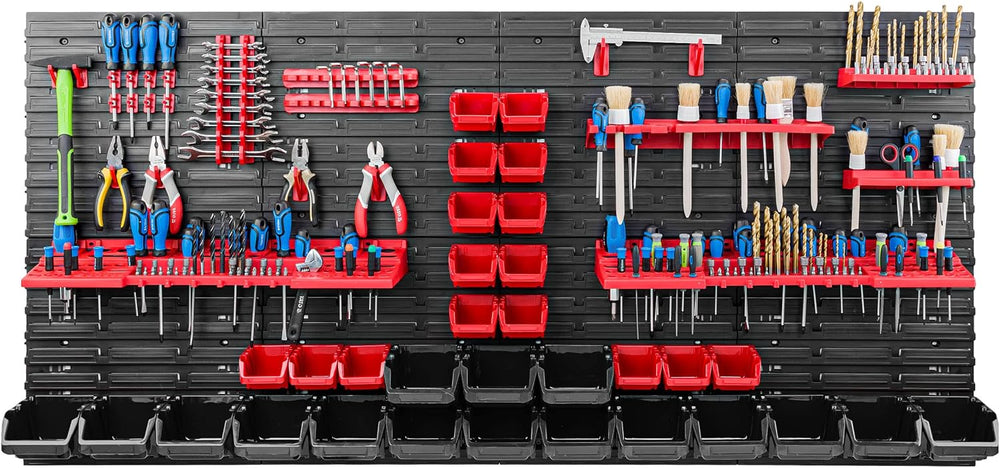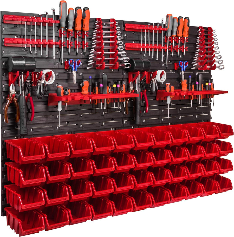 PAFEN Lagersystem - 1544 x 780 mm - Wandregal 75x Schwarz Stapelboxen und 38 stück Rot Werkzeughalte