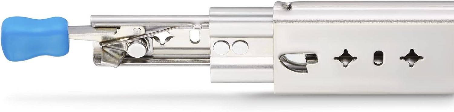 - Mit Feststellfunktion - Die Schiene rastet automatisch ein, wenn diese komplett eingeschoben wird. Um die Schublade heraus zu ziehen, wird der Hebel kurz angehoben. Ausserdem kann mit dem Hebel die Innen- von der Aussenschiene getrennt werden. Hier ist