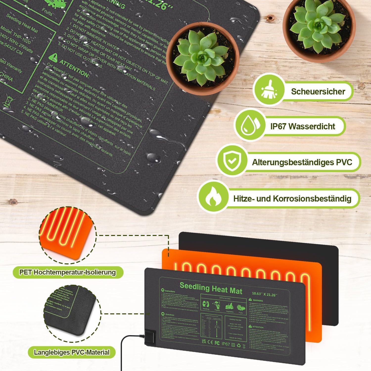 - 【Langlebiges Material】Die äussere Schicht der pflanzen heizmatte besteht aus langlebigem PVC-Material und die beiden mittleren Schichten aus einer hochtemperaturbeständigen PET-Isolierschicht mit wasserdichter IP67-Performance, die einen