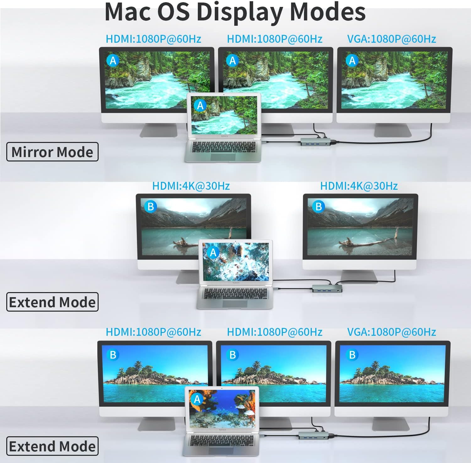 • 【WINDOWS-Dreifachanzeige】Dreifachanzeige: HDMI+HDMI+VGA, aber nur das Windows-System unterstützt die Dreifachanzeige; Mac OS wird nicht unterstützt. Spiegeln oder erweitern Sie Ihren Bildschirm mit einem USB-C-Adapter-Monitor. Streamen Sie 4K Ultra