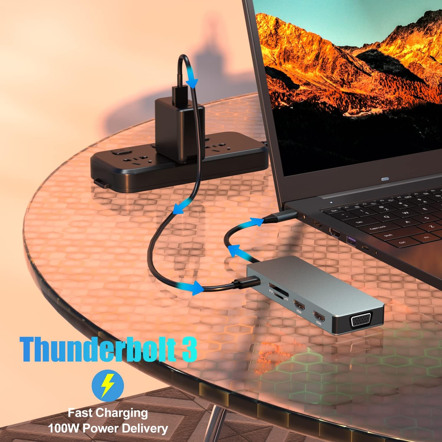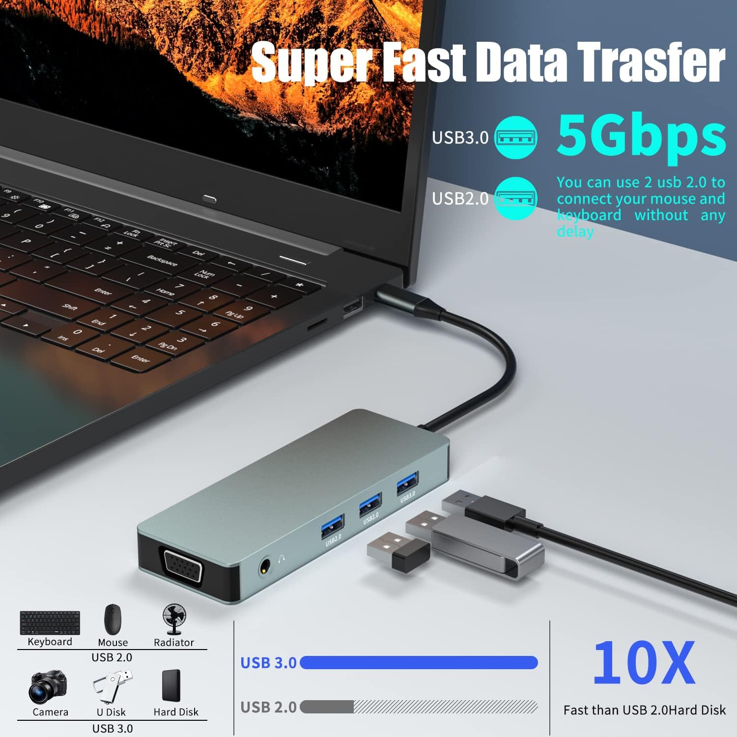 • 【10-in-1-USB-Dockingstation】 Dieser USB-C-Hub verfügt über HDMI, VGA, 3,5-mm-Stereo-Audioeingang und -ausgang, SD- und TF-Kartenleser, 1 x USB 3.0 (Super Speed 5 Gbit/s) abwärtskompatibel, 2 x USB 2.0 (480 Mbit/s), PD3 .0 USB-C-Aufladung. Die