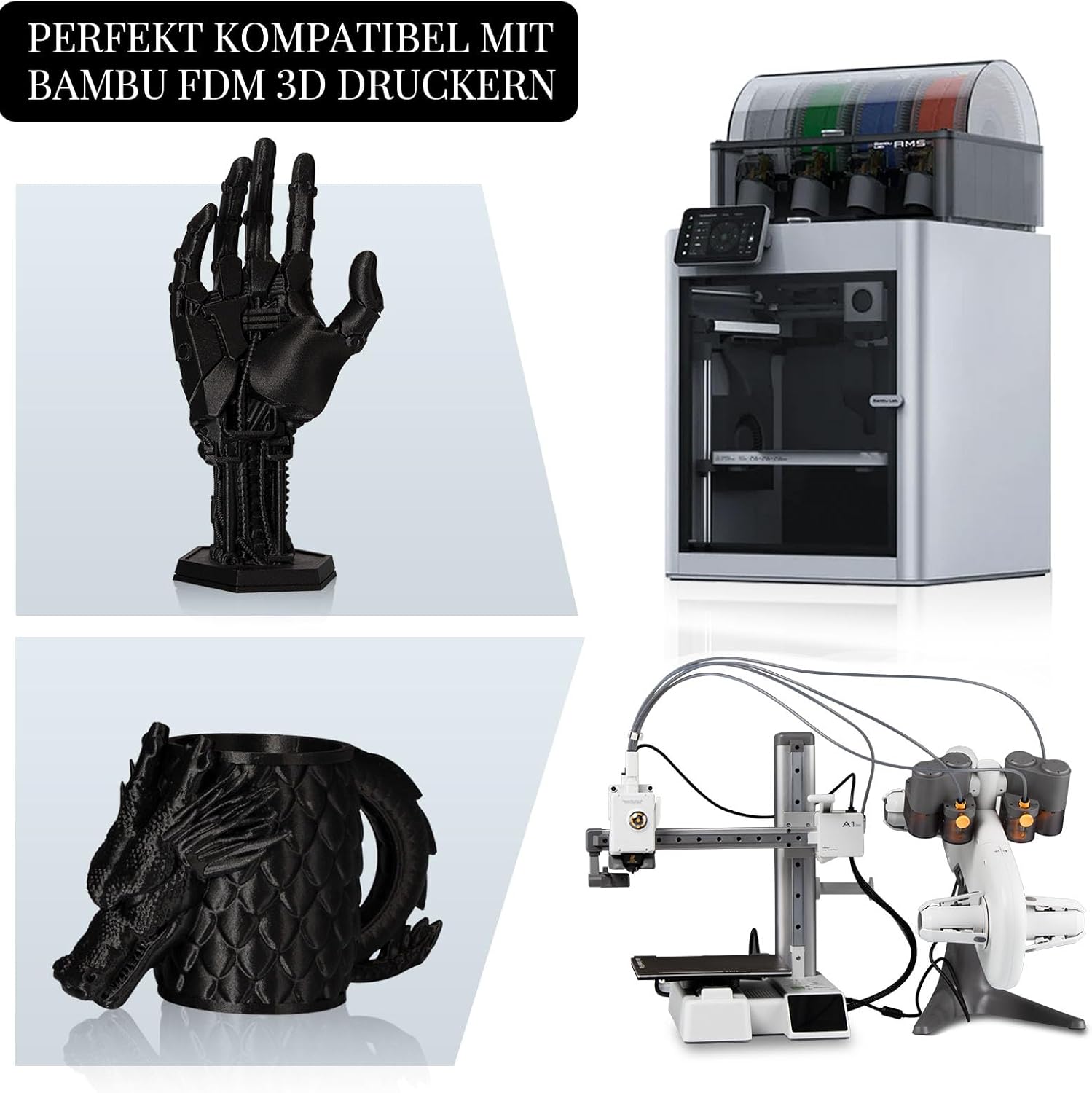 • Sehr einfach mit dem BAMBU FDM 3D-Drucker zu drucken, fast keine Verformung. Leicht und langlebig, geeignet für Anwendungen, die Torsions-, Zug- und Schlagfestigkeit erfordern. Es ist ein ideales Material für Drohnenteile, Rennsportmodelle und