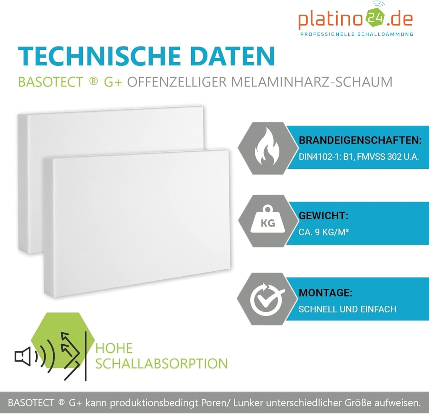 - Technische Daten Basotect: ◻ Schwer entflammbar nach DIN4102-1: B1, FMVSS 302 u.a ◻ Offenzelliger Melamin-Schaumstoff ◻ Farbe: HELLGRAU ◻ Raumgewicht: ca. 9 kg/m³ ◼ Basotect G+ ist eine Marke der BASF ◼ Basotect G+ kann produktionsbedingt Poren / Lunker unterschiedlicher Grösse aufweisen