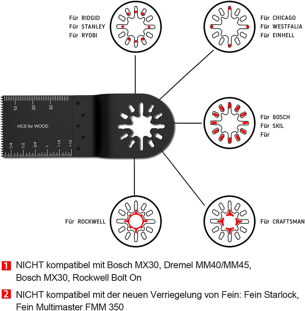 - Universelle Schnittstelle passt für die meisten Oszillierende Multi-Tools(Nur passt für alte Version):Mastercraft/Milwaukee/Skil/Handwerker/RIDGID/tacklife/WEN/Ferm/hi-spec. (Nicht kompatibel mit der neuen Verriegelung von Fein)