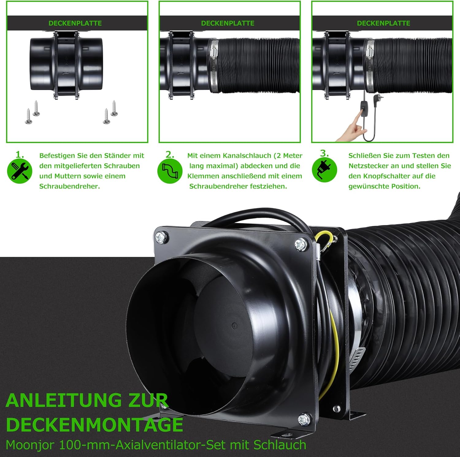 - PRAKTISCHES KIT: Das Set wird mit 1 x Axiallüfter, 1 x PVC-Schlauch (100mm x 2m) und zwei Schellen geliefert. Ideal für Anfänger in der Pflanzenzucht mit einem kleinen Growzelt.