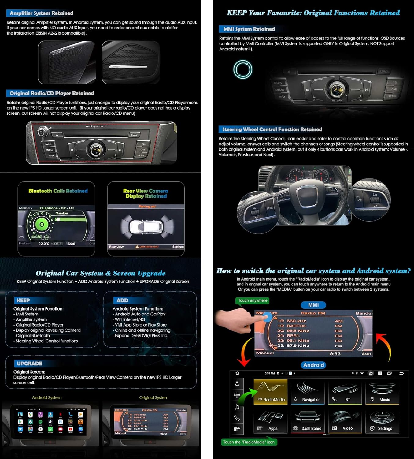 • 【KEEP Original System Functions】Keep original MMI System, einfachen Zugriff auf alle Funktionen im ursprünglichen System; Keep original Verstärker-Sound-System; Keep original Radio / CD-Player-Funktion; Display original Rückfahrkamera; Keep