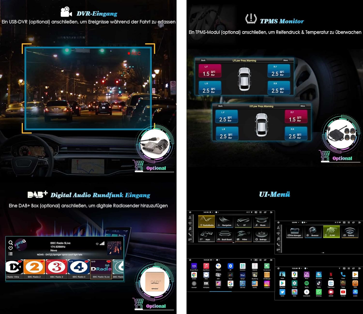 • 【Carpaly & Android Auto & DSP】✔ Verwenden Sie Carplay über Bluetooth, Android Auto über Bluetooth/USB-Verbindung, Zugriff auf GPS, Anrufe, Musik von Smartphones auf Autoradio-Grossbildschirm, machen Sie Ihr Fahren einfacher und sicherer. ✔