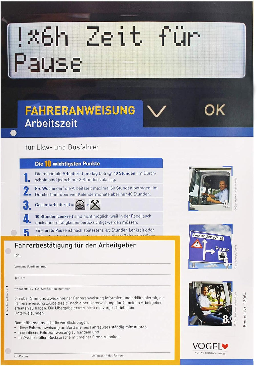 10er Pack Fahreranweisung Arbeitszeit für LKW- und Busfahrer Anweisung Anordnung Verhaltensregeln