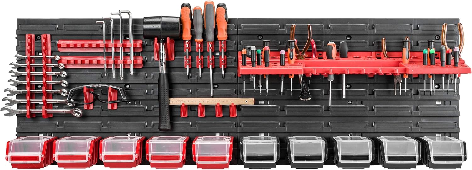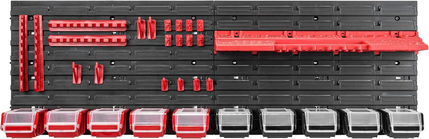 - Gesamtabmessung 115 x 39 cm |Material Kunststoff | Stapelboxen 5 x Rot mit Deckel 100 x 155 x 70 mm + 5 x Schwarz mit Deckel 100 x 155 x 70 mm | Werkzeughalter 1 x Schraubenschlüsselablage | 2 x Klemmleisten | 4 x Werkzeughaken M klein | 4 x